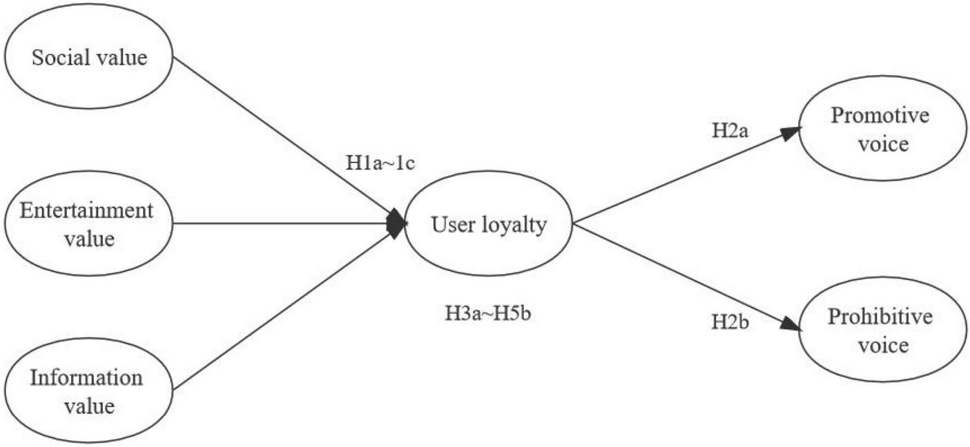 Some social media have loyal users before they use the brand, and these user loyalty comes from word-of-mouth and promotion by other users who have used the brand before; some social media gradually acquire user loyalty through the platform after they have used it, and these user loyalty comes from their own experience and feelings (Namisango et al., 2021a). These users loyalty comes from their own experiences and feelings (Namisango et al., 2021a). For social media to be sustainable, users must ultimately become loyal to the brand. Some users become supporters of social media through the promotional voice of other users before using it; others become loyal to the social media after using it based on the combined evaluation of the social value, entertainment value and information value obtained. Social media serves as a key channel for informal marketing promotion and plays a significant role in influencing user loyalty. The use of social media to communicate brands and products influences users’ attitudes and behaviors toward brands. Customer Voice is the act of a customer spontaneously making constructive suggestions to a company to help the company’s community, products or services; Customer Voice includes the promotive voice, which emphasizes innovative ideas and suggestions, and the prohibitive voice, which refers to customers pointing out real and potential problems (Liang et al., 2012). The function of spreading brand and fostering user loyalty can only be truly realized when social media has a large number of loyal users (Tajvidi et al., 2020). Clearly, the relationship between the Customer Voice and their loyalty to social media has a reciprocal effect. Therefore, it has been suggested that social media can be used to promote the sustainability of social media by leveraging user loyalty to brands, i.e., fostering user loyalty to social media.