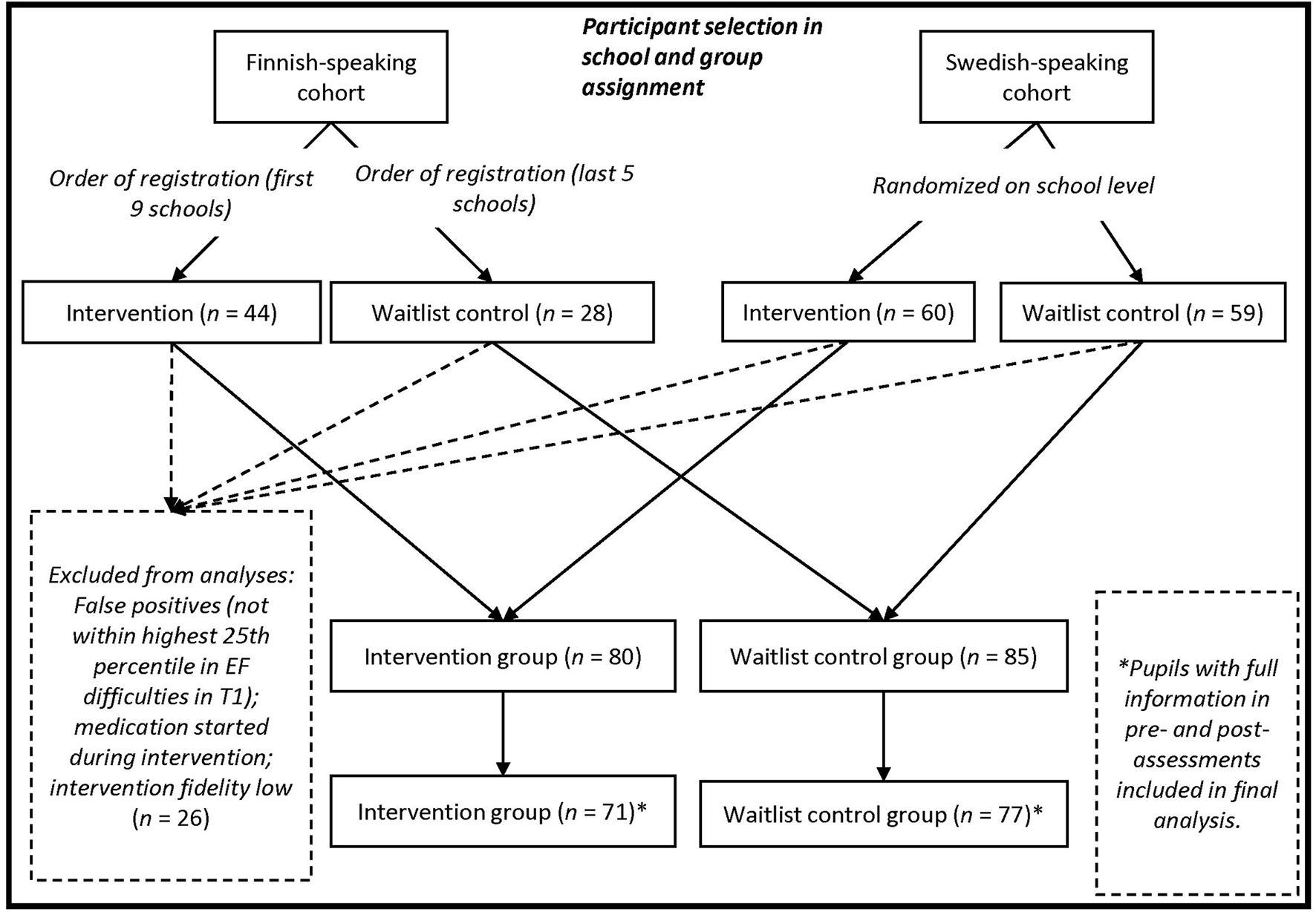 Altogether, 191 pupils were assigned to the intervention group (n = 104) or waitlist group (n = 87). The participants' first languages were Finnish (n = 71 [43 in intervention group], 37.2%), Swedish (n = 119 [60 in intervention group], 62.3%), and Russian (n = 1 [in intervention group]; 0.5 %). All participants followed the standard curriculum and were fluent in the instructional language. Pupils who started ADHD medication during the intervention period, pupils not within the top 25th percentile regarding EF difficulties and children in intervention groups with low implementation fidelity were excluded from the analysis of intervention effect. Pupils with full information in pre- and post- assessments were included in the final analysis (Figure 1).