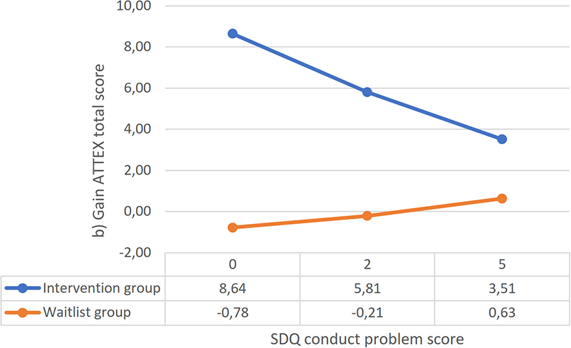 To answer the research questions, mixed-model ANOVA was used to analyse changes in outcome measures (i) between pre- and post-intervention and (ii) between pre-intervention and follow-up assessments. In the models, the ATTEX scores at three time points (pre-intervention, post-intervention, and follow-up) were entered as within-subject factors and the group as a between-subject factor. Group × moderator interaction analyses were conducted to determine how moderators influenced the intervention outcomes. In case a group × moderator interaction was statistically significant or very close to statistical significance, additional analyses were conducted to determine how moderators influence the intervention outcomes. The moderator analyses (levels of cognitive abilities and conduct problem severity) were performed using the Johnson-Neyman method and Process Macro 3.4. (SPSS extension; Hayes, 2018) which allows to analyse a range of pre-intervention values in which groups differ in their intervention gain relative to values of the moderator values. The ATTEX pre-intervention and post-intervention assessment time point scores were set as the within-subject factors and the group × moderator as an interaction term. Pre-intervention ATTEX Total score was entered as a covariate to improve the accuracy of the model (Langberg et al., 2018).