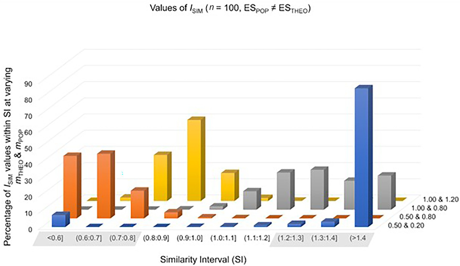 Finally, given a sample size of n0 = n1 = 100, values of ISIM fall inside the SI in approximately 69% of repetitions of setting 1 (ESPOP = 1.20, ESTHEO = 1.00), compared to approximately 97% of repetitions of a study setting where the theoretically predicted effect matches the population effect (ESTHEO = ESPOP = 1.20). The 28% difference between false positives and true positive predictions suggests that it is more likely that values of ISIM fall inside the SI if the theoretical prediction matches the population effect than otherwise.