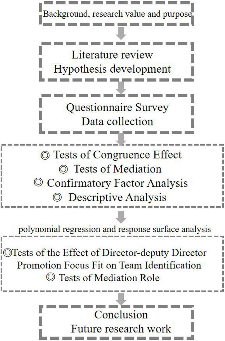 Figure 1 shows the technology roadmap in this article. This article first introduces the background of the topic, then carries on the literature review and puts forward three research hypotheses. Next, this article collects data manually and preprocesses data through a questionnaire survey by using confirmatory factor analysis and descriptive analysis. In the empirical study, this article takes polynomial regression and response surface analysis to study the effect of director-deputy director promotion focus fit on team identification. Finally, the summary and limitations of the study are presented in the last chapter.