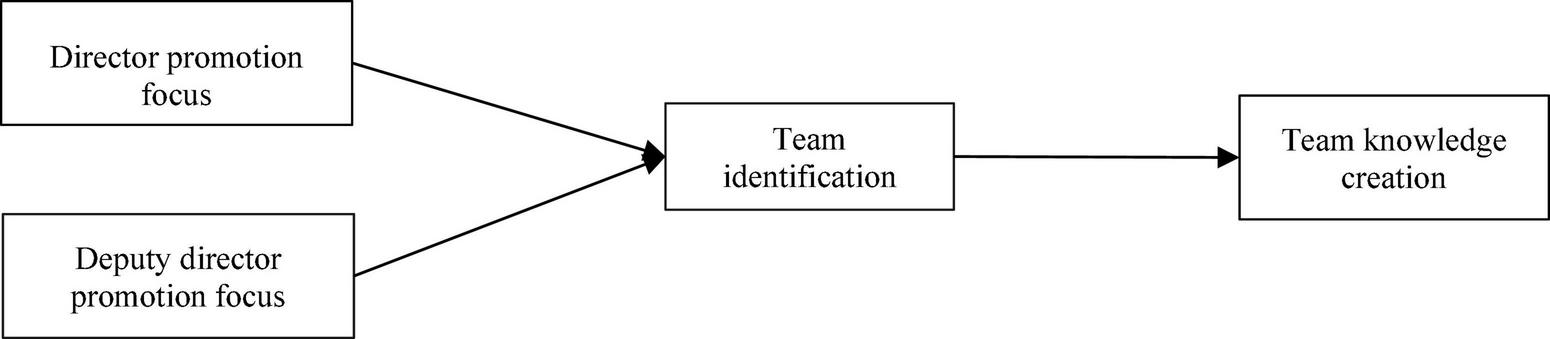 To reveal how the promotion focus of the director and deputy director work together on team knowledge creation, this study will introduce social identity theory to elucidate the mediating mechanism between the two. Social identity theory suggests that differences are the leading cause of differentiation within a team and that asymmetries can undermine intra-team homogeneity, hinder the social identity process, or, worse, will intensify conflict (Tajfel and Turner, 2004). In a team, the leader’s personality traits or role-behavior characteristics are essential information received by the members, and team members will self-define and categorize themselves accordingly (Gao and Zhao, 2014). When director-deputy director congruence in promotion focus, the closer the duo’s pursuit of internal team processes and work goals, the deputy director’s advocacy and modeling of the director’s philosophy will convey to team members a robust conceptualization of common goals, thus making team members more able to perceive team identity and increase their sense of team identification (O’Leary and Mortensen, 2010; Luan and Xie, 2014). In summary, the primary research purpose of this study is to explore the influence of director-deputy director promotion focus fit on team knowledge creation and the mediating role of team identification between them based on social identity theory.