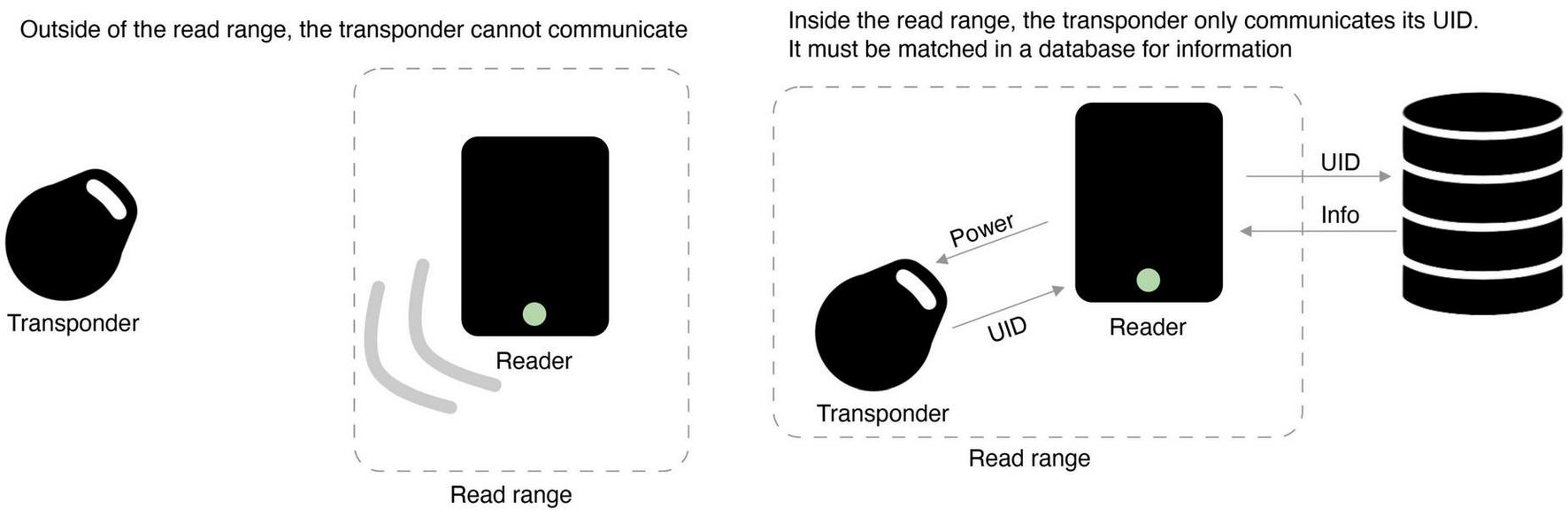 RFID and NFC use radio waves to transmit data from transponders (tags) to an external reader (Buyurgan et al., 2009). The two differ in the frequencies used to communicate. The transponders cannot store any, or much, data; some only contain a unique ID (UID) while others can store a few bytes. Therefore, a data processing system is also required to link the UID to additional information. For example, in an implanted pet microchip, the microchip links the UID of the tag to an ID in a database that contains the information; no information is stored on the microchip itself (illustrated in Figure 1). Insertable microchips in humans work the same way.