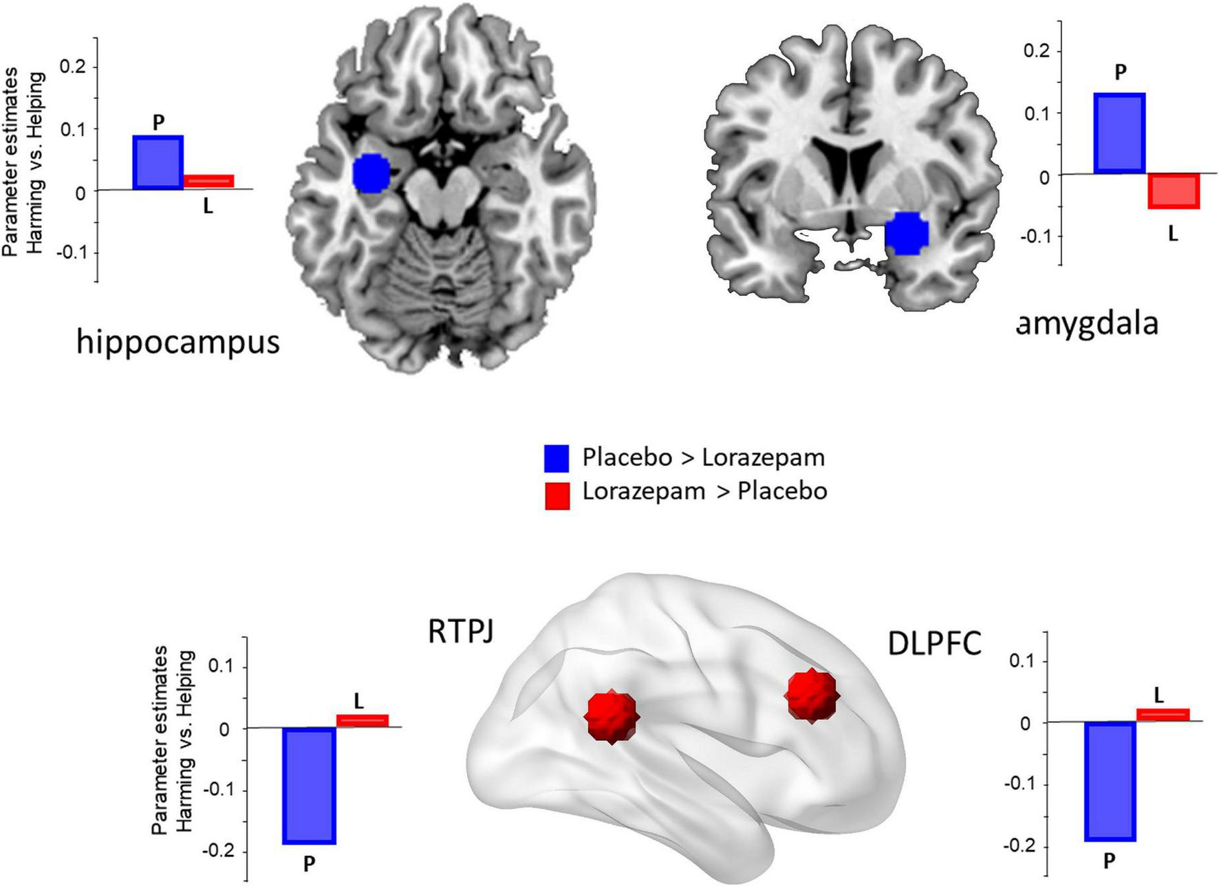 Table 2 lists the brain regions showing a significant hemodynamic change to coercive harming and helping after placebo and lorazepam administration. In response to coercive harming (vs. neutral), both lorazepam and placebo administration showed activations in the amygdala, hippocampus, putamen, anterior insula, temporal pole, thalamus, orbitofrontal cortex, dorsomedial prefrontal cortex, and dorsolateral prefrontal cortex (dlPFC) (Figure 1C). Regions with greater activity during coercive harming vs. helping showing significant hemodynamic increase were the anterior insula, amygdala, hippocampus, orbitofrontal cortex, dorsomedial prefrontal cortex, and dlPFC. On the other hand, regions with greater activity during coercive helping vs. harming showing significant hemodynamic increase were the dlPFC, rTPJ, and posterior cingulate.