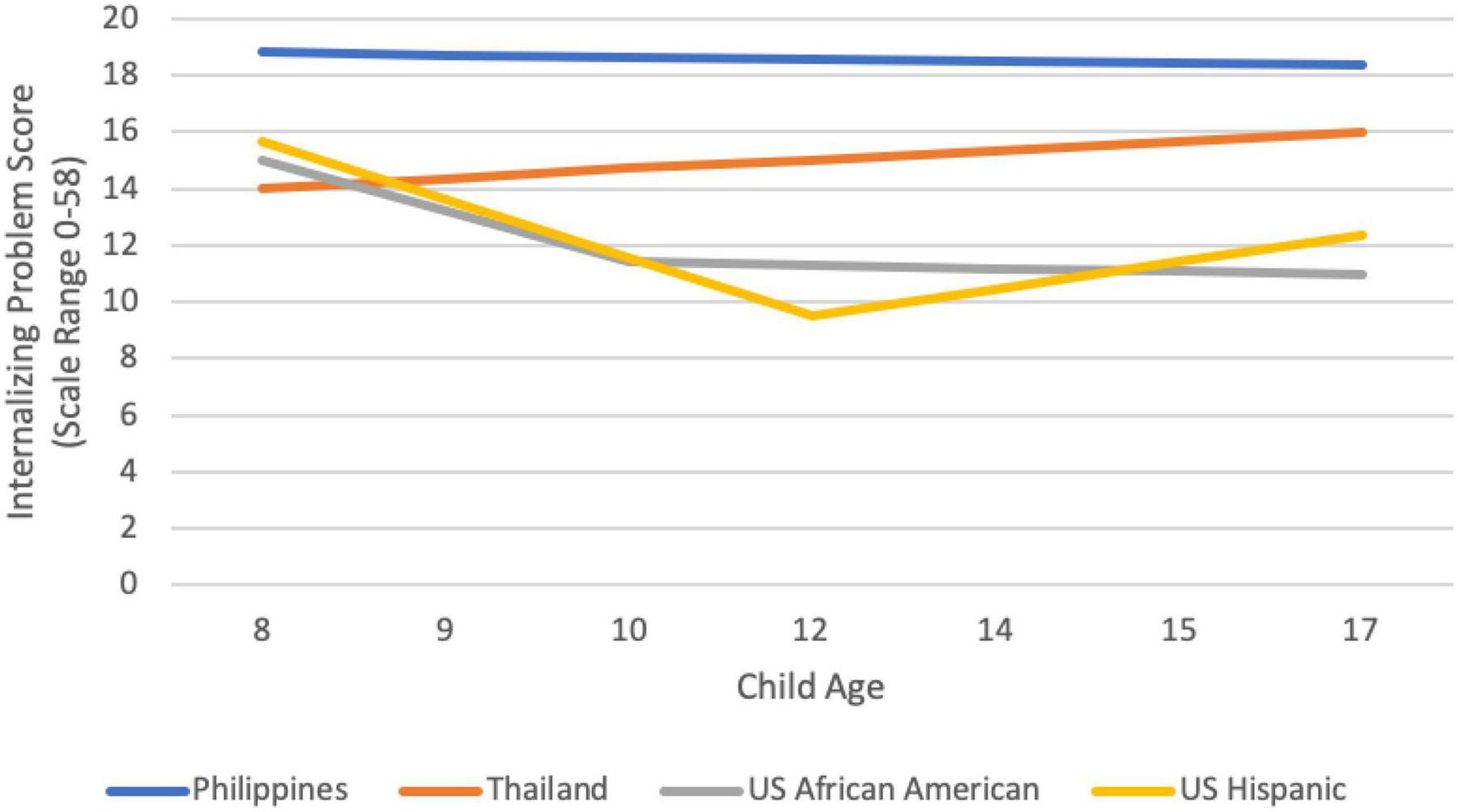 For most cultural groups, at most ages, levels of adolescent internalizing were not significantly different from the average levels of internalizing across all sites. However, there were significantly higher levels of adolescent internalizing at all timepoints in the Philippines; at ages 8, 9, and 14 in Colombia; at age 17 in Rome; and at age 10 in Thailand. Compared to the average levels of internalizing across all groups, there were significantly lower levels of internalizing at ages 8, 9, and 10 in Kenya; at ages 9, 10, 12, and 14 in Sweden; at ages 15 and 17 in the U.S. African American sample; and at age 12 in the US Hispanic sample.