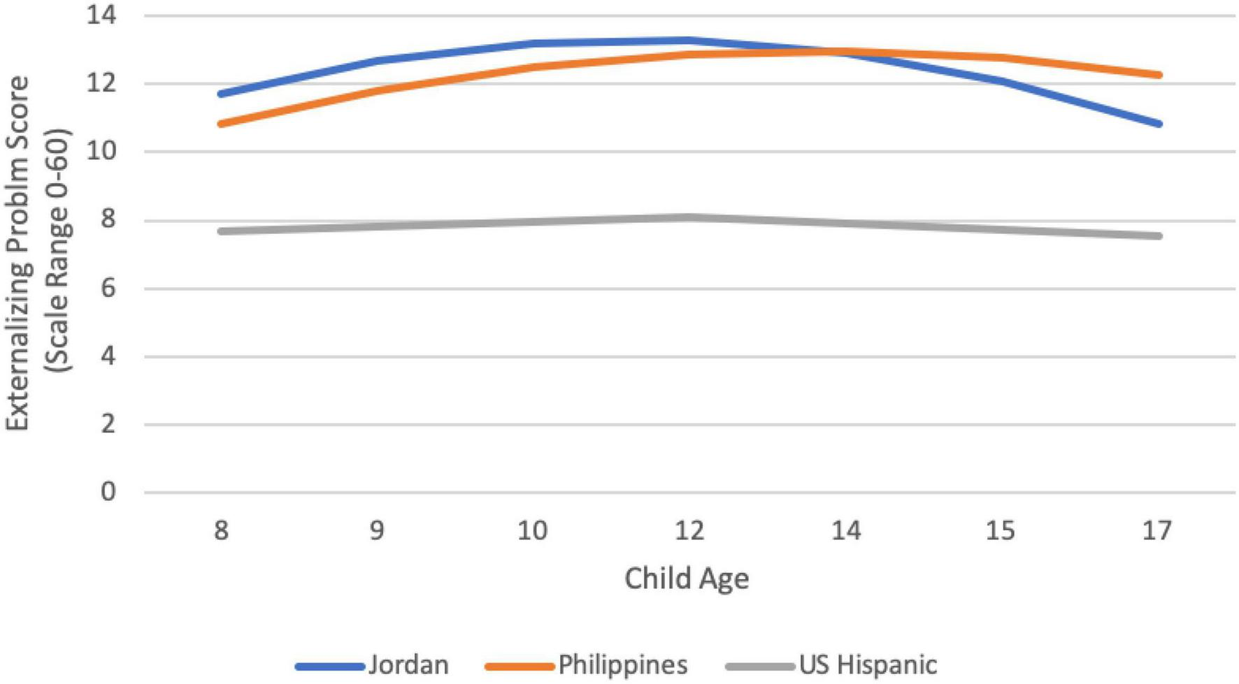 Externalizing peaked at age 10 in Kenya (M = 9.20); at age 12 in Jordan (M = 13.72), and in the U.S. African American sample (M = 10.11); at age 14 in Thailand (M = 13.51), Colombia (M = 13.37), the Philippines (M = 13.24), Rome (M = 12.50), the U.S. European American sample (M = 12.09), Naples (M = 11.49), and the U.S. Hispanic sample (M = 8.97); and at age 15 in Sweden (M = 10.89). The lowest peak (U.S. Hispanic sample, age 14) is equivalent to a score of 0.30 on the original scale and the highest peak is equivalent to a score of 0.46 (Jordan, age 12). Thus, at its peak, externalizing across ages and countries remains between “not at all” and “somewhat or sometimes true” on the original scale. For most of the countries examined, the peak occurs at age 14.