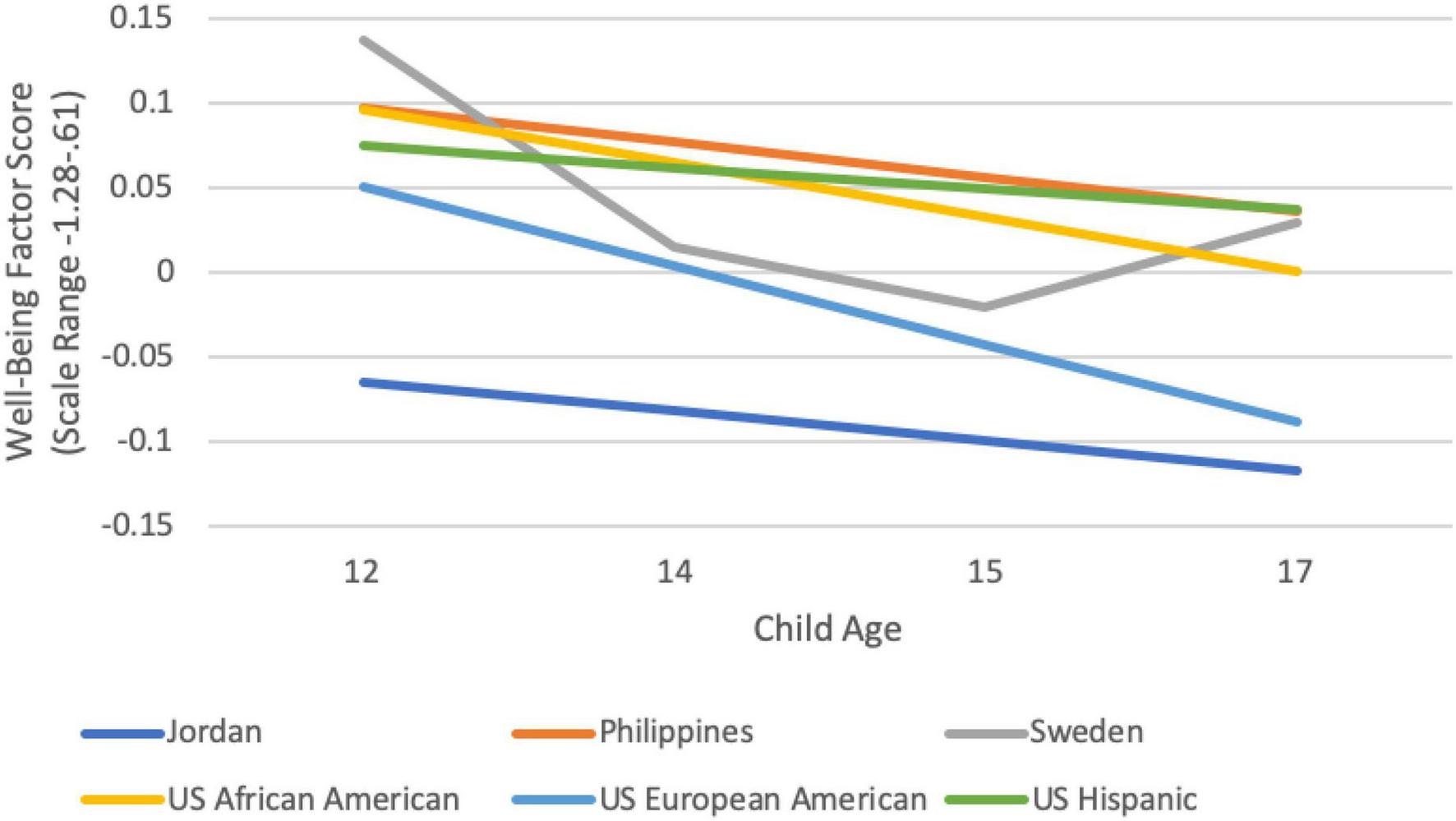 Mean levels of wellbeing were at their lowest at age 14 and 15 in Colombia (M = 3.74 at both times); at age 15 in Rome (M = 3.44), Sweden (M = 3.49), Thailand (M = 3.53), Naples (M = 3.55), the U.S. African American sample (M = 3.63), the U.S. Hispanic sample (M = 3.68), the Philippines (M = 3.73), and Kenya (M = 3.93); and at age 17 in Jordan (M = 3.36), and in the U.S. European American sample (M = 3.43). The range of these averages is from 3.36 (Jordan, age 17) to 3.93 (Kenya, age 15). Thus, at its worst, average wellbeing across ages and countries indicates moderate to high wellbeing.