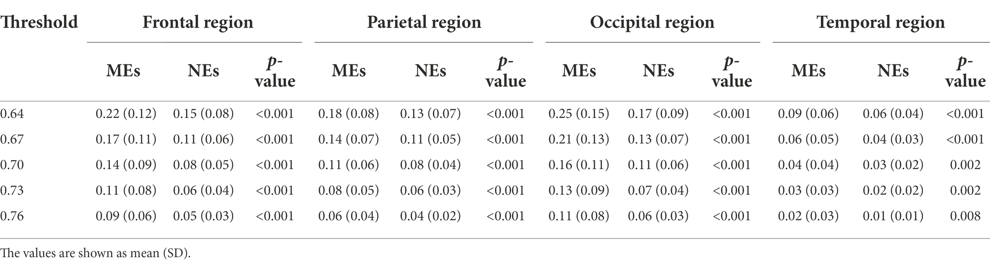 For the gamma network, the averaged nodal efficiencies are shown in Figure 4. The nodal efficiency of the frontal, parietal, and occipital regions in the MEs was significantly higher than in the NEs at all thresholds (Table 4). However, there was no significant difference in nodal efficiency in the temporal region at a threshold of 0.76.