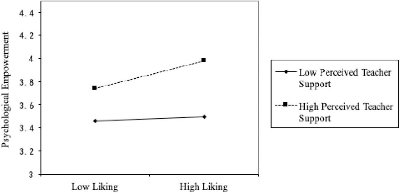H4: Perceived teacher’s support has a positive moderating effect between student–teacher’s liking and psychological empowerment. In other words, the higher the students’ perceived teacher’s support, the higher the students’ psychological empowerment from the student–teacher’s liking.