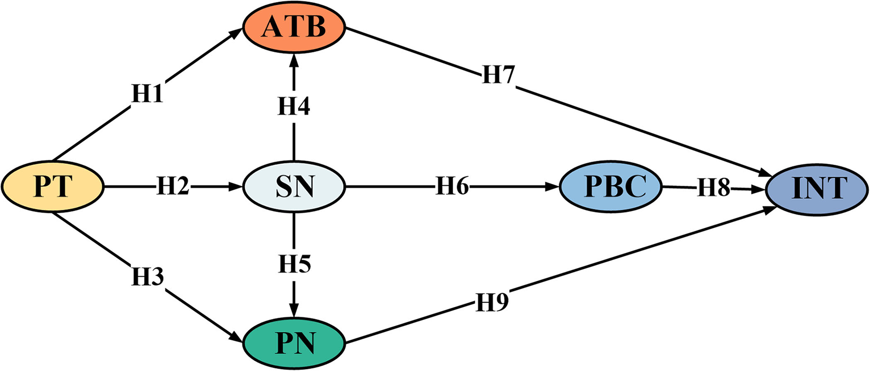 Subjective norm is the antecedent variable of PN and has a direct role in verifying that one's decision-making behavior is consistent with one's social value, and it is usually used as a measure of whether social behavior is consistent with right morals and values (Bamberg et al., 2007; Zhang et al., 2018). The relationship between SN and ATB shows that the perceptions of others or groups may affect one's ATB (Rezaei et al., 2019). If friends and family share the view that substations can improve the stability of electricity consumption and promote economic and social development, then due to herd mentality and dependency, an individual may hold the same attitude toward substation projects. The direct link between SN and PBC exhibits that the endorsement of substation projects by others, in response to society, institutional, and other pressures, may reduce the perceived barrier encountered by one's decision-making process (O'Neil, 2021). Based on this, the following hypotheses are proposed:
