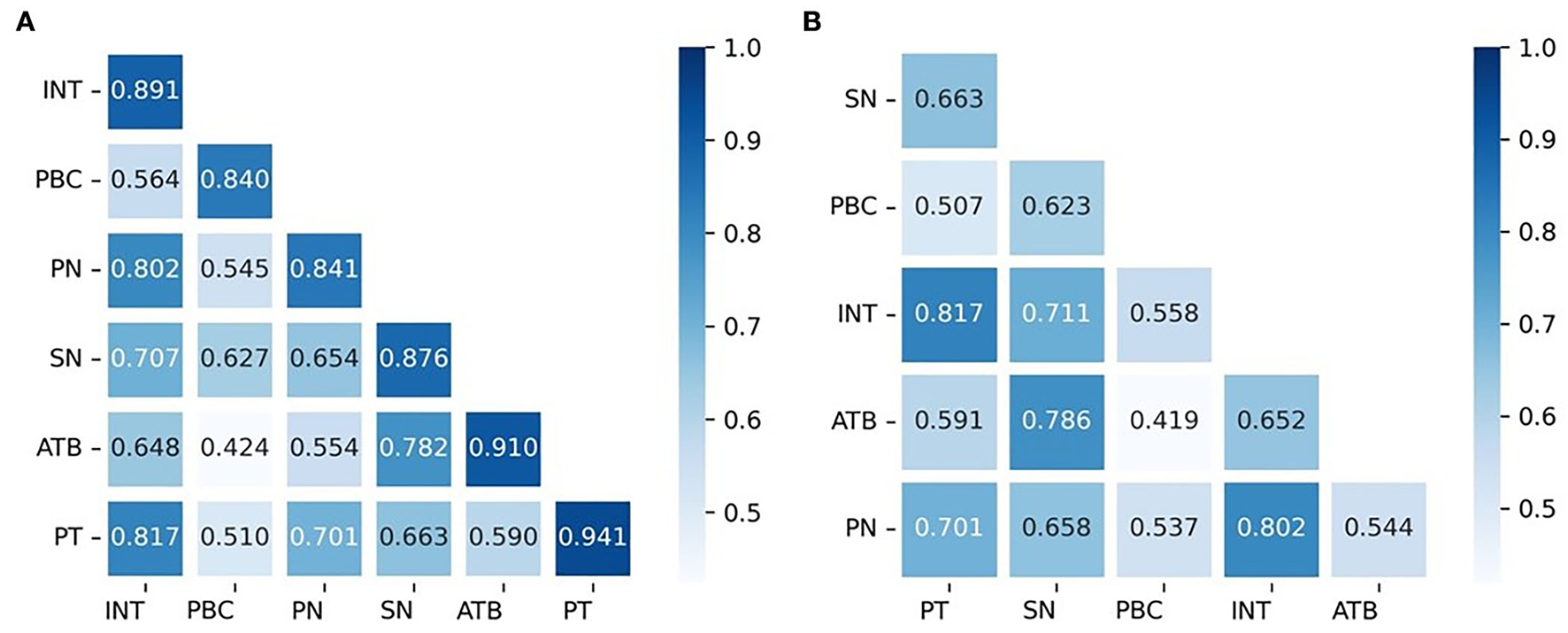 In this study, a seven-point Likert-type scale, with “1” indicating “strongly disagree” and “7” denoting “strongly agree,” is used to measure six variables of willingness of the public to participate (INT), public trust (PT), attitudes to behavior (ATB), subjective norms (PNs), personal norms (SNs), and perceived behavioral control (PBC) in the substation project. Table 2 depicts the construct and items of observed variables. The standard deviation of each measured item is larger than 1, and the mean value was larger than 5.2, showing that the respondents have a higher recognition degree for the items (Qin et al., 2020). The scale design and descriptive statistics are shown in Table 3.