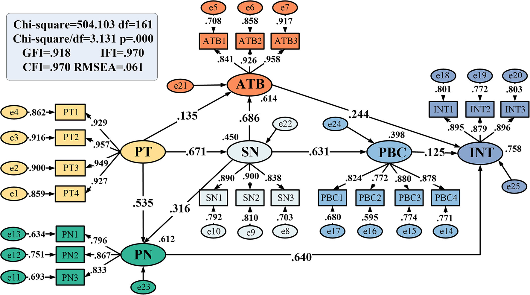 The measurement scales and indicators adopted for the present study with the goal of measuring all the studied construct variables are validated by previous studies. Following Liu Y. et al. (2018), a four-item PT measurement scale is used, and the respondents are asked to express their degree of agreement to site selection process/equipment and technology/expert analysis/construction process. A three-item ATB measurement scale using in this study mainly refers to the research views of Zhang et al. (2017), Rezaei et al. (2019), and Qin et al. (2020), in order to ascertain whether one would approve or disapprove substation is valuable and useful for living quality or social development. Based on Rezaei et al. (2019) and Qin et al. (2020)'s study, a three-item SN measurement scale is used to measure the social pressure felt by one person whether to support the construction of the substation. Following Zhang et al. (2017) and Qin et al. (2020), a three-item PN measurement scale is also used to measure one's own judgment on the construction of a substation. Adapted from Zhang et al. (2017), Rezaei et al. (2019), and Qin et al. (2020)'s study, a four-item PBC measurement scale is used to measure one's belief in the inherent difficulty in completing a certain behavior, meaning that a person makes a decision to participate/not participate in the construction of a substation not simply under his/her volitional control. Following Qin et al. (2020), a three-item INT measurement scale is used to find out his/her willingness to participate in the construction of a substation.