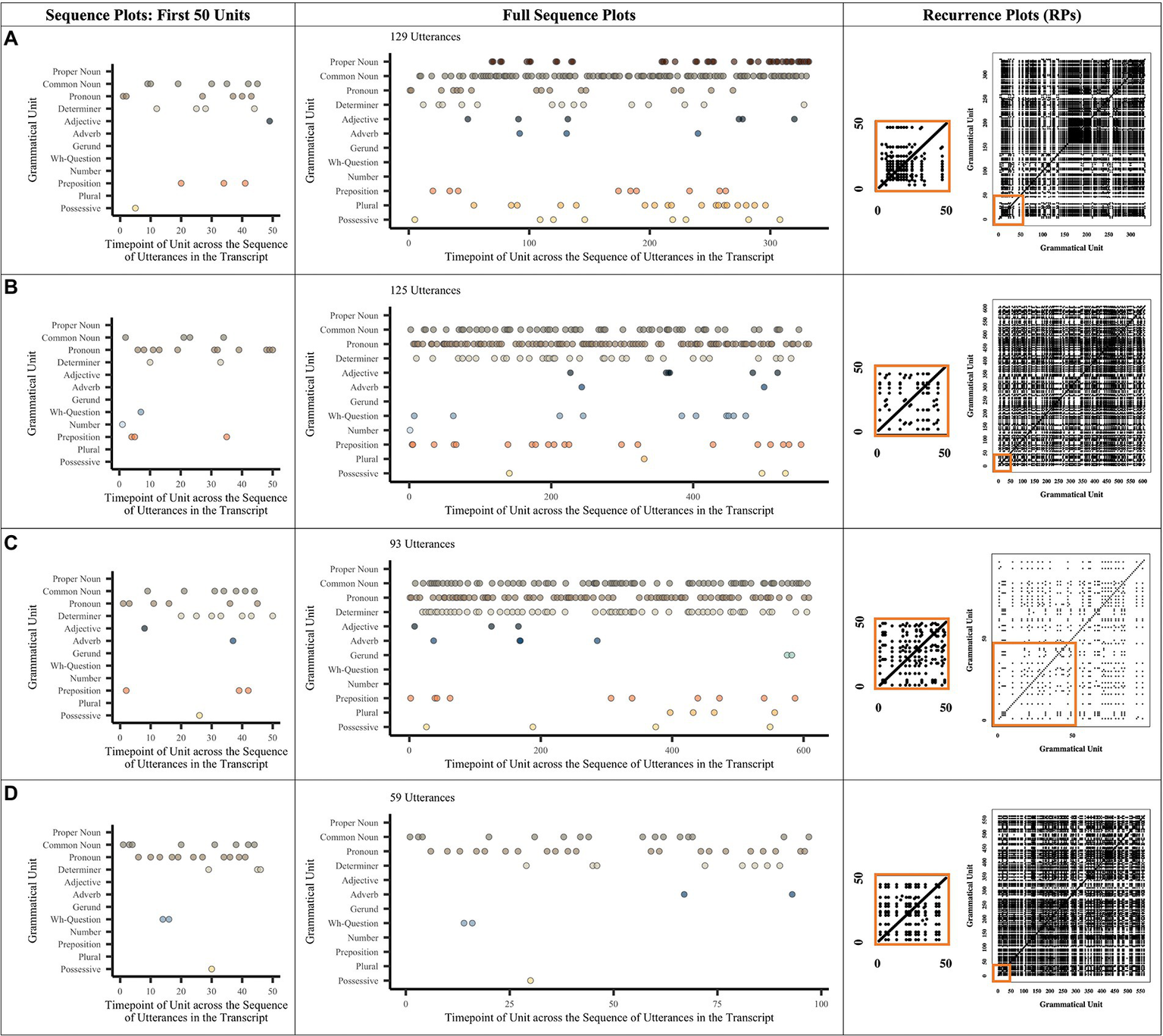 We do this first by focusing on the degree to which lexical and grammatical units repeat within the language data from 5-year-old children with ASD. To answer this question, we reanalyze the dataset from Wittke et al. (2017) due to the heterogeneity of syntactic ability within its sample (including, e.g., children who were highly talkative or minimally talkative, children who produced many or few grammatical errors; see Wittke et al., 2017, for additional information about participants and tasks). These data provide an excellent opportunity to apply RQA to capture this variability because the summative analyses used in the initial study may have masked meaningful language information in the sample. Because learning the structure of grammar involves learning how to combine both words and grammatical elements (e.g., nouns, verbs, morphemes) in rule-governed ways, we quantify the degree to which children repeat specific lexical items (and the grammatical units that make up these lexical items) with items they have never heard in combination before, what we call “syntactic recurrence.”