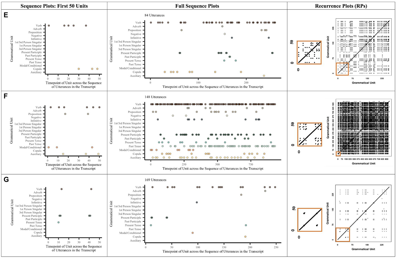 A nonlinear approach to studying productivity would allow for the representation of linear interactions within child language as well as a broad range of other special component interactions informative to syntax that often get masked by summative analyses. Furthermore, this approach does not make assumptions about the distribution of data points across a sequence or even their stationarity (i.e., how the mean state changes across a sequence of behaviors); this is meaningful for small data sets, as well as data sets that contain outliers. This is true of many language studies containing heterogeneous groups of children with ASD. Thus, one potentially valuable tool to characterize the unfolding of grammatical abilities in ASD into a fruitful syntax typology is RQA, a technique to understand how units of speech repeat across stretches of transcriptions.