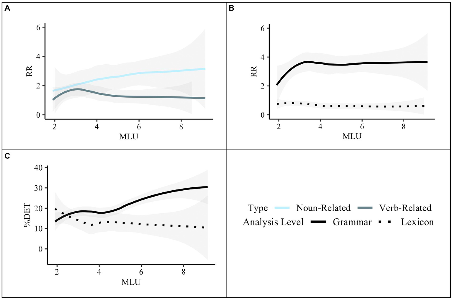 Second, although we know that lexical and grammatical production abilities range from average to highly impaired, what these differences in language abilities mean for the productivity of syntax—or the degree to which specific lexical and grammatical items are used with different items—remains unclear. For example, we might expect a child who is not productive to only use the word “the” with the word “cat,” whereas a child who is productive would use “the” with all sorts of nouns. Degrees of productivity could be indicated by different recurrence measures, in that children who may be less recurrent in their individual lexical and grammatical productions may also be more recurrent in their patterns of productions. For instance, if a child just produces noun phrases (e.g., “the cat,” “a big bear,” and “the bank”), they are highly recurrent in individual grammatical productions (e.g., repeating determiner-noun or determiner-adjective-noun) but less recurrent across a range of grammatical phrases. Having a more advanced syntax means that the child is moving beyond noun phrases; that is, a productive speaker would link noun phrases using verb phrases (e.g., “would love to play with the cat”) and prepositional phrases (e.g., “I would love to play with the cat in the morning”). This type of analysis is considerably more sensitive than a gross language measure like MLU, which captures the length of utterances but not the grammatical complexity or novelty of word combinations.