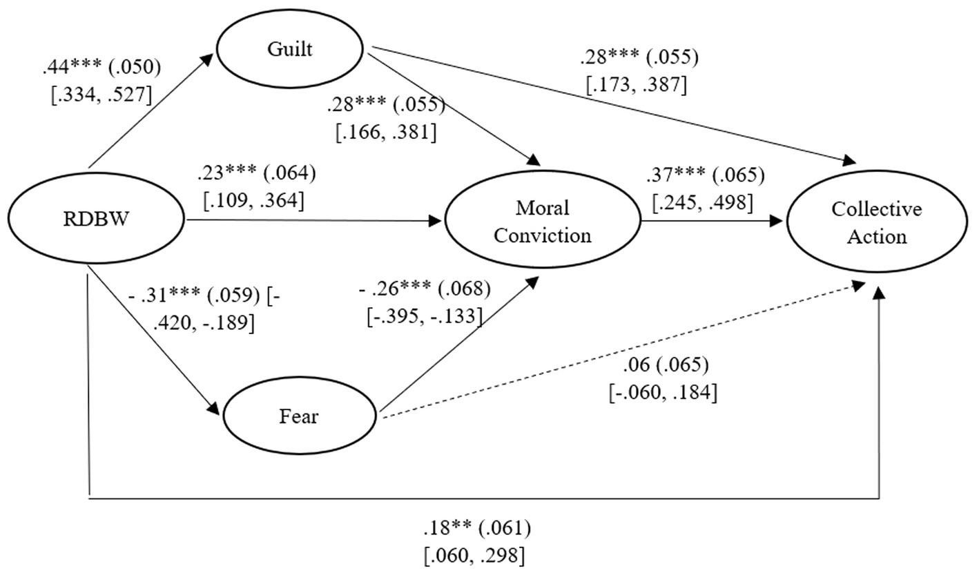 With regards to the covariate, political orientation was negatively related to RDBW, β = −0.26, SE = 0.048, p < 0.001, 95% CI [−0.347, −0.164], moral conviction, β = −0.10, SE = 0.045, p = 0.023, 95% CI [−0.190, −0.015], and collective action β = −0.14, SE = 0.048, p = 0.003, 95% CI [−0.239, −0.050]. Political orientation was not significantly related to guilt, β = −0.02, SE = 0.050, p = 0.635, 95% CI [−0.116, 0.065], whereas it had a positive association with fear, β = 0.20, SE = 0.053, p < 0.001, 95% CI [0.102, 0.309]. In other words, the more participants were right-wing oriented, the lower their levels of RDBW, moral conviction, and collective action intentions were, and the higher their feelings of fear2.