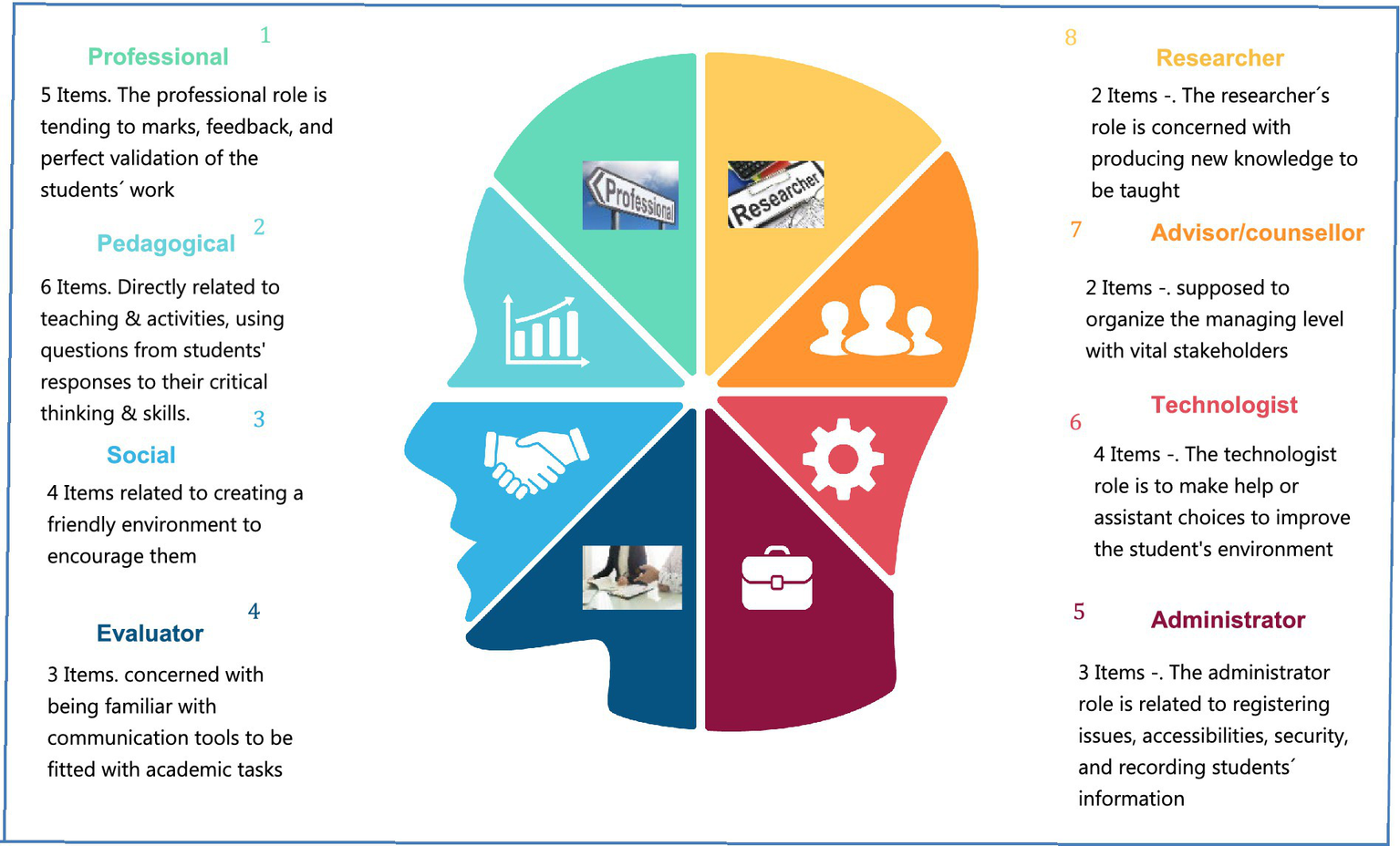 Bawane and Spector’s model (Bawane and Spector, 2009) which was used as a primary model in this study tried to elaborate competency categorization and the roles of teachers in online education creating one model. They constructed a comprehensive model based on the analysis of more than 10 researchers which consists of eight comprehensive roles: professional (role), pedagogical, evaluator, administrator, technologist, advisor/counsellor, and researcher. Each of these roles consists of sub-roles that cover all the details (see Figure 1).