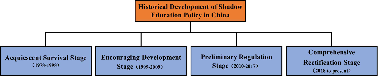 Shadow education, also known as off-campus training or off-campus tutoring, takes place outside of mainstream school education focused on the school subjects and charges a fee (Stevenson and Baker, 1992). Shadow education exists globally, especially in many East Asian countries (Manzon and Areepattamannil, 2014). The development of shadow education has a wide range of historical origins. For instance, in the middle of the 19th century, Russian students had a private tutor and by the end of the 19th century, tutoring institutions appeared. Around the 1980s, the topic of shadow education was published in the China Youth Daily (Zhang and Bray, 2020). The focus of shadow education policies in China is different in different periods. At present, it is guided by the “dual reduction” policy and adopts strict control of shadow education. Japan stipulates that the tuition institution is a service-oriented industry and must not be subject to the constraints of economic laws and regulations and must not endanger the rights of consumers. South Korea has included tuition education within the public education system. Different countries have adopted specific policies and regulations on shadow education. As a kind of extracurricular tutoring, shadow education has three characteristics: First, it is a supplementary tutoring education, tutoring for subjects that are taught in school. Second, it is private and is provided by enterprises or individuals for profit rather than by public education funds or voluntary tutoring. Third, it focuses on academic subjects and tuition for cultural courses such as Chinese, Mathematics, and English, and not art subjects (Postlethwaite, 2000). However, with the development of shadow education, this definition cannot completely summarize the changes and differences in shadow education. However, the mainstream education system is still accompanied by the important role played by shadow education (Ghosh and Bray, 2020). Therefore, this study mainly discusses the extracurricular tutoring and extramural training that exist outside mainstream education in schools. With the development of China’s economy and the improvement of society and culture, China’s education continues to grow and develop, and so does shadow education alongside it (Zhang and Liu, 2016). With the expansion of off-campus training institutions, it is of great importance to systematically examine and carry out an in-depth analysis of the evolution of China’s shadow education governance policies, clarify what shadow education governance policies are and why they have changed over time, and discuss how to further improve them based on the practice of educational development in the new era. This will help to better solve the problems and challenges in China’s shadow education governance, promote equity in education, and provide a reference for other countries to formulate shadow education policies.
