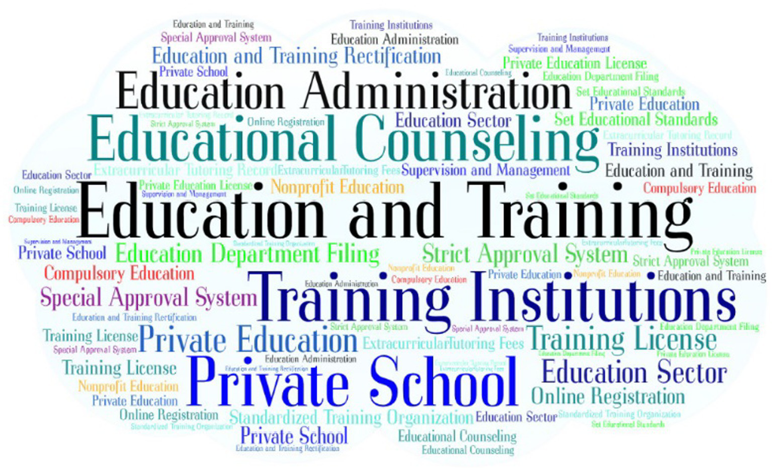 In February 2018, the General Office of the Ministry of Education and other four departments issued the “Notice on Effectively Reducing the Extracurricular Burdens of Primary and Secondary School Students and Carrying out Special Governance Actions for Off-campus Training Institutions,” which directly targeted off-campus training institutions to establish special governance and opened the prelude to the “burden reduction.” Shadow education governance entered a stage of comprehensive rectification. Subsequently, the Ministry of Education, the State Council, and other national competent authorities successively issued the “Notice on Accelerating the Promotion of the Special Governance of Off-campus Training Institutions,” “Opinions on Regulating the Development of Off-campus Training Institutions,” “Notice on Effectively Doing a Good Job in the Special Governance and Rectification of Off-campus Training Institutions Work,” “Notice on Improving Several Working Mechanisms for Special Governance and Rectification of Off-campus Training Institutions,” and other policy documents within 1 year. In August 2018, the General Office of the State Council issued the “Opinions on Regulating the Development of Off-campus Training Institutions,” which was the first systematic document in China to regulate the development of off-campus training institutions at the national level. Thus, the supervision of China’s shadow education entered a new era with laws and regulations to follow. The word frequency of the policy text at this stage is shown in Figure 3. During this stage, the shadow education policies that were issued became more specific and targeted. “Education and Training,” “Training Institutions,” “Private Schools,” and “Education Sector” appeared more frequently in the policy texts, the reason being that the policy at this stage directly aimed to rectify off-campus training. China has concentrated on social resources to rectify off-campus training, aiming to achieve the effect of “double reduction” and reduce the burden on primary and secondary schools. The appearance of terms such as “Training License,” “Strict Approval System,” “Education Administration,” and “Supervision and Management” demonstrate the determination of the Chinese government to take a drastic and comprehensive rectification of off-campus training.