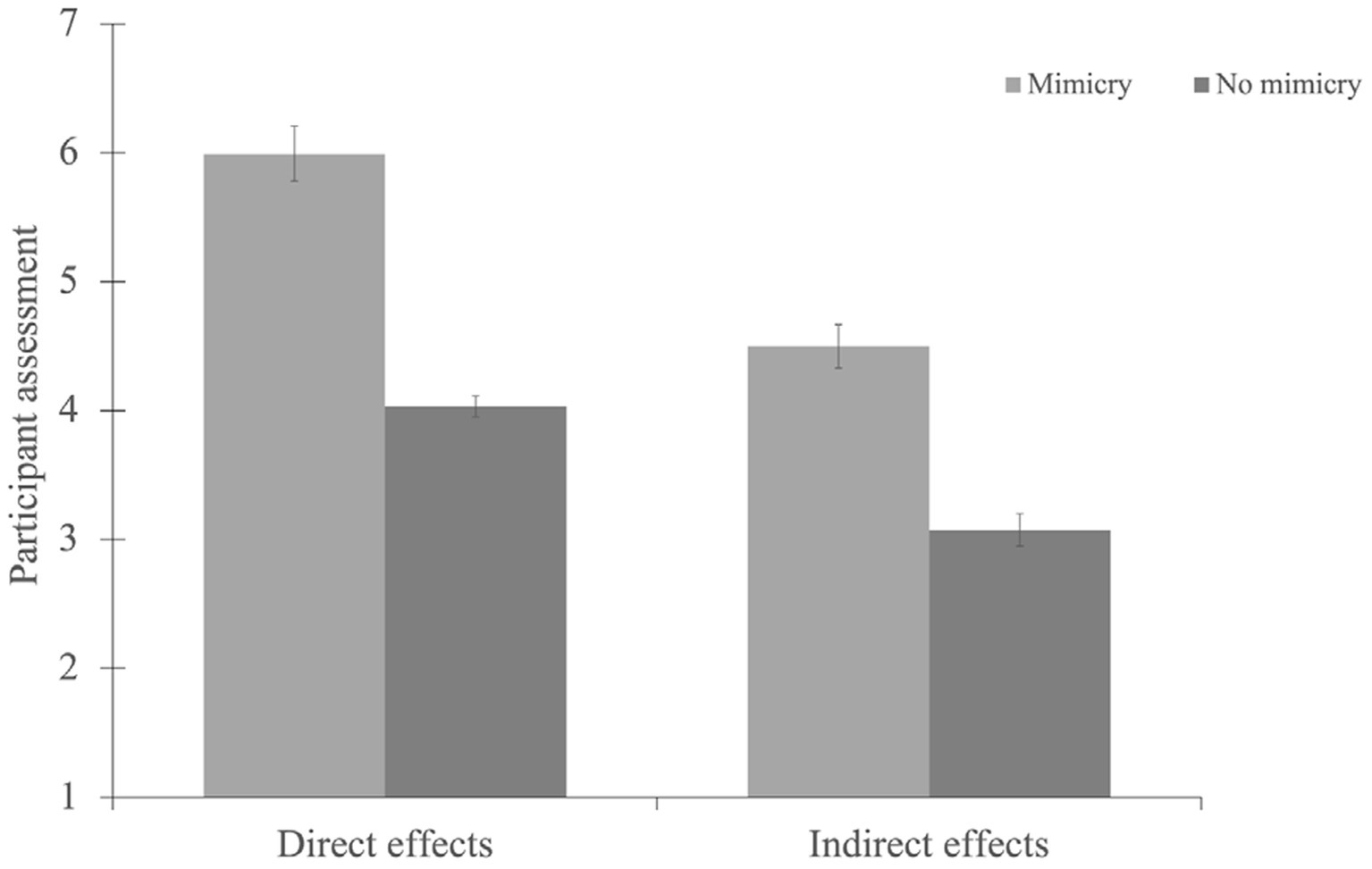 In order to check the efficiency of the verbal mimicry manipulation within the indicator of direct and indirect effects of mimicry, a mixed model consisting of one between-subject factor—experimental condition (2: mimicry vs. no mimicry)—and one within-subject factor— directness (2: direct effects of mimicry vs. indirect effects of mimicry) was run.