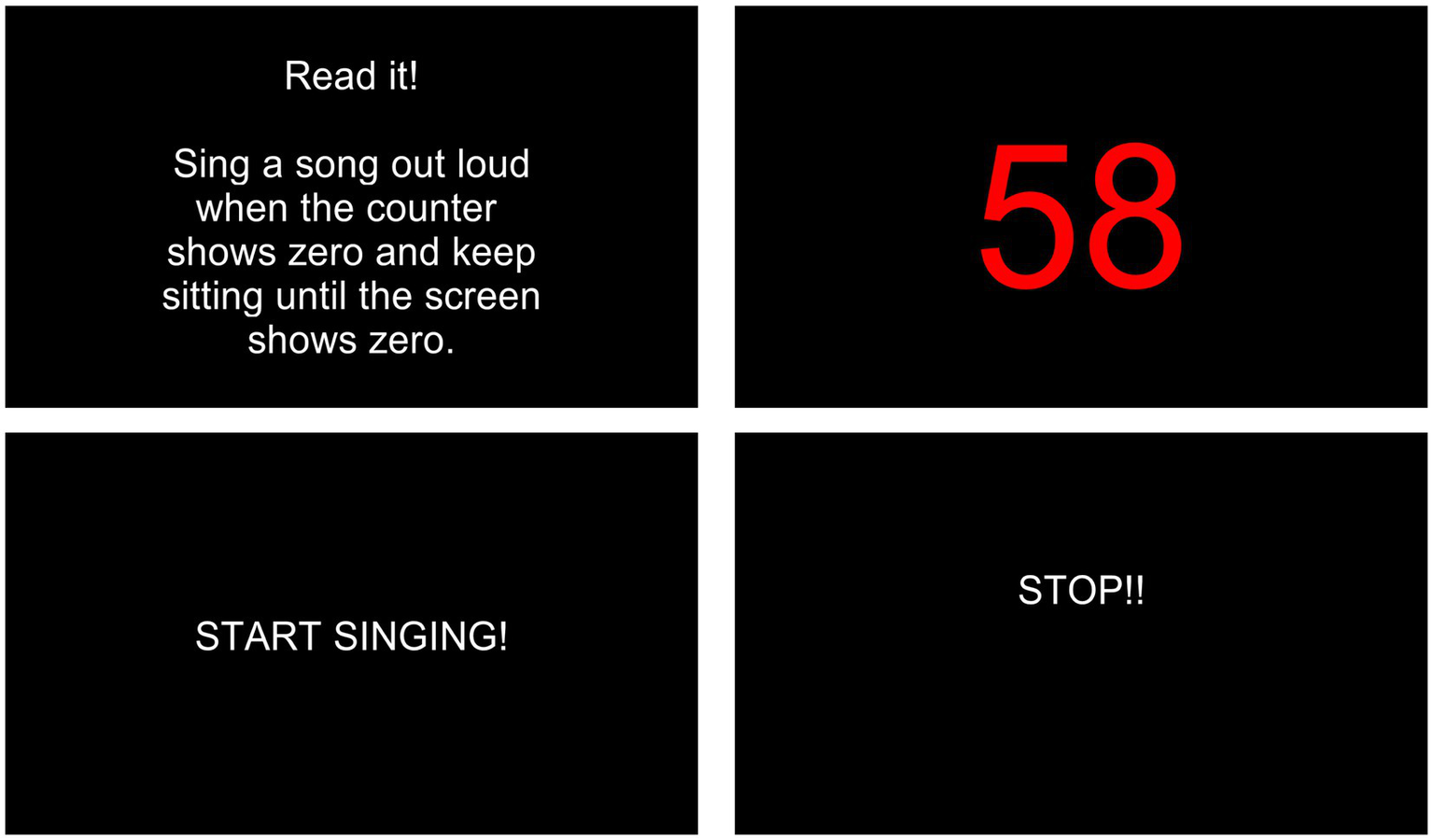 The SSST developed by Brouwer and Hogervorst (2014) induced stress in this study. It is a novel, ethically compliant experimental method to induce stress quickly and easily. It can also control distractions from sensory input and body movement (Brouwer and Hogervorst, 2014). SSST used in this study was based on Setiatama and Kusrohmaniah’s (2019) study. The subjects from both groups were asked to sing any song in front of unknown people, i.e., the researcher, the assistant, and the operator, to provoke a social-evaluative threat. Social evaluative threats occur when essential aspects of oneself are, or could be, negatively judged by others (Brouwer and Hogervorst, 2014). Therefore, anticipating and watching oneself sing in front of an audience causes a solid neuroendocrine stress response (Dickerson and Kemeny, 2004) and elicits emotional stress (Harris, 2001). This study administered the SSST by instructing a task to participants in a sequence that could be seen on a flat screen (Figure 1). The first instruction, “Read it! Sing a song out loud when the counter shows zero and keep sitting still until the screen shows zero,” for 10 min. Next, the screen would show a 60-s countdown. Then, the screen showed “start singing” instructions for 15 s. Simultaneously, the subject had to sing a song until the screen showed a “stop” instruction as a sign for the participants to cease singing.