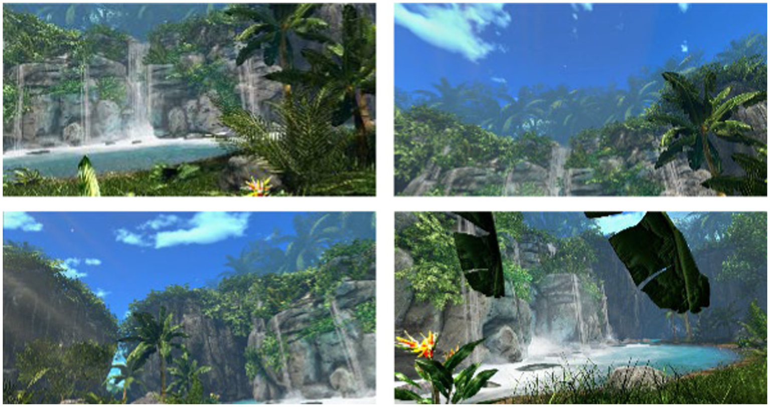 Unlike film or 2D video, virtual reality can provide a more immersive experience. According to Slater and Sanchez-Vives (2016), virtual reality users can experience “being there” in the virtual world through their immersive experience. The therapeutic potential is greater when the experience is more immersive (De Kort and Ijsselsteijn, 2006). Virtual reality users can also get clear, authentic experiences and a high sense of presence, which increases emotional responses and relaxation (Berto, 2014). Currently, virtual reality has been displayed through a fully immersive head-mounted display (HMD), making it possible to isolate the user’s senses from the outside world (Witmer and Singer, 1998; Higuera-Trujillo et al., 2017).