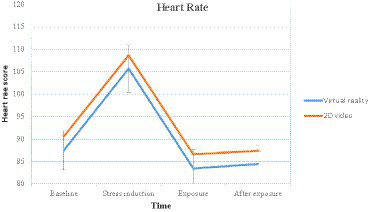 All the STAI and APQ data for each group could be analyzed (n = 25 for the virtual reality group, n = 28 for the 2D video group). However, one set of heart rate data in the 2D video group could not be analyzed (n = 25 for the virtual reality group and n = 27 for the 2D video group). In addition, one skin conductance data point in the virtual reality group and three in the 2D video group could not be analyzed (n = 24 for the virtual reality group and n = 25 for the 2D video group).