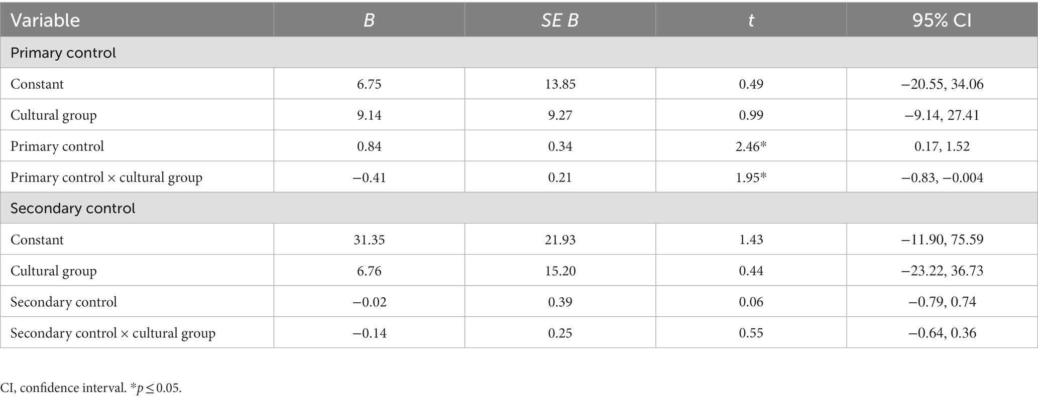 Correlation analyses are presented in Table 2. As shown in Table 3, the moderation term was approaching significance for primary control, R2Δ = 0.02, F(1, 203) = 3.81, p = 0.05. We followed up the interaction using simple slopes analysis. As shown in Figure 2, primary control was significantly associated with PTSD symptoms for the Australian group, B = 0.44, SE = 0.16, t = 2.76, p < 0.01, 95% CI[0.12–0.74], but not the Malaysian group, B = 0.02, SE = 0.14, t = 0.15, p = 0.88, 95% CI[−0.26–0.30]. Cultural group did not moderate the association between secondary control and PTSD symptoms, R2Δ = 0.001, F(1, 203) = 0.31, p = 0.58.