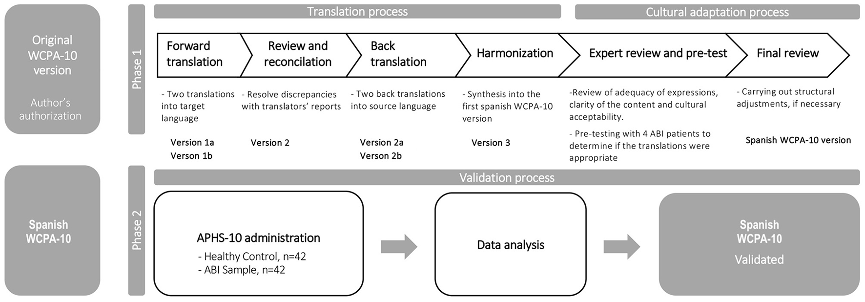 The study consisted of two phases: (I) translation and cross-cultural adaptation of the 10-item version of the WCPA (Toglia, 2015) for the Spanish population, and (II) its validation in a Spanish sample of ABI patients and healthy participants. To ensure semantic and conceptual equivalence between the translated items and the original ones, the translation and cultural adaptation process was carried out following the guidelines for translating and adapting tests recommended by the Quality of Life Special Interest group (QoL-SIG) and the Translation and Cultural Adaptation group (TCA group) of the International Society for Pharmacoeconomics and Outcomes (ISPOR) (Wild et al., 2005) and by the International Test Commission (2017). Before starting the process, we obtained permission from the original author of the WCPA, maintaining constant communication with her via e-mail to clarify doubts about the test items or other questions that arose during the process.