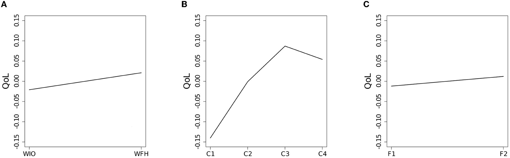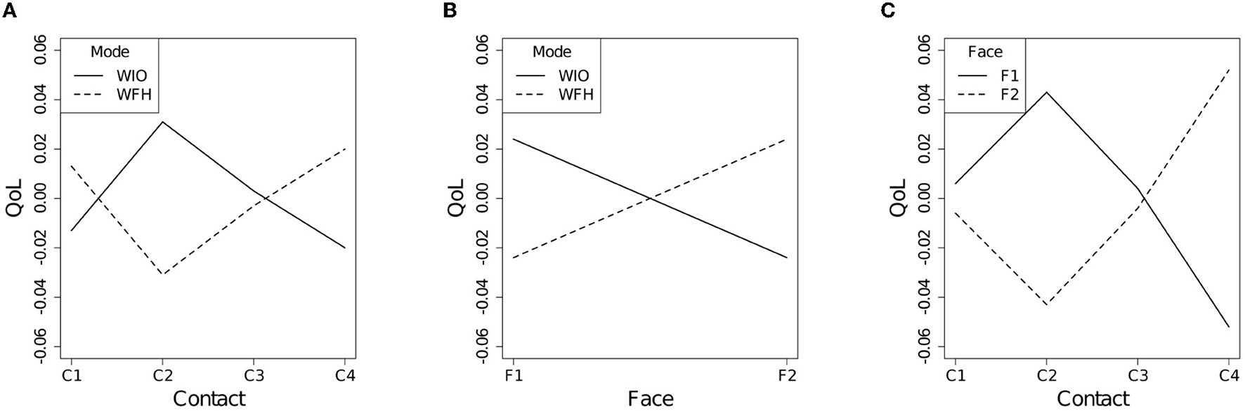 The interaction effect between the work mode and the social contact quantity [the (e) term] was significant []. As shown in Figure 2A, for the WFH employees, their QoL increased as their social contact quantity increased. Yet, their QoL decreased at the C2 level. Additionally, the interaction effect between the work mode and the face-to-face contact ratio [the (f) term] was significant []. As plotted in Figure 2B, for the WFH employees, their QoL increased as the face-to-face contact ratio increased. Additionally, the interaction effect between the social contact quantity and the face-to-face contact ratio [the (g) term] was significant. As demonstrated in Figure 2C, when over half of the social contacts were face-to-face, the employees QoL increased as the social contact quantity increased. However, the QoL decreased at the C2 level.