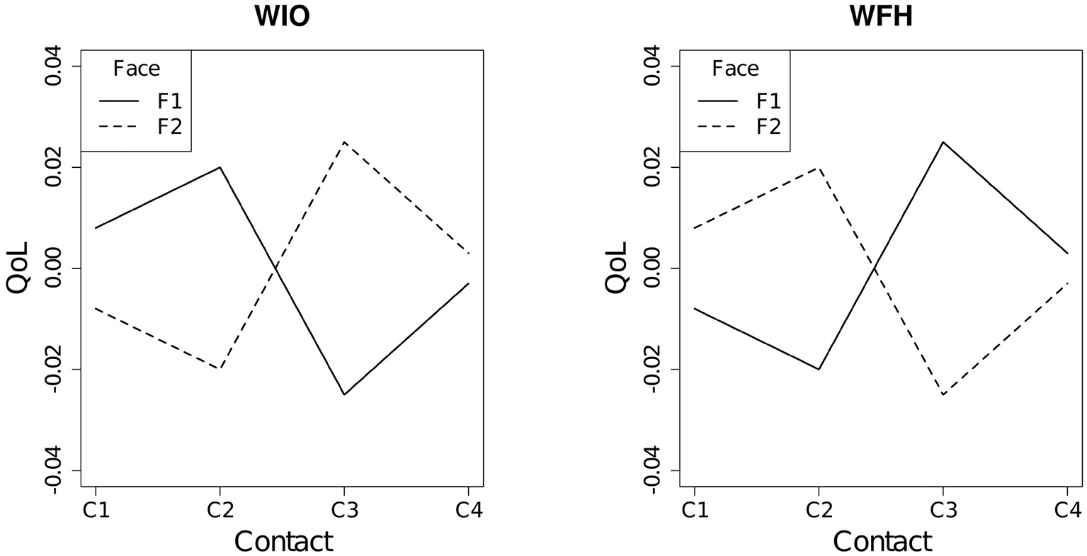 The three-way interaction effect among the type of work modes, the social contact quantity, and face-to-face contact ratio [the (h) term] was significant []. As shown in Figure 3, the difference in the QoL at the C4 level of social contact quantity between the F1 and F2 levels was the lowest. Furthermore, for the WIO employees, when over half of the social contacts were face-to-face (F2), the QoL decreased at the C1 and C2 levels of social contact quantity but increased at the C3 level. On the contrary, for the WFH employees, when over half contacts were face-to-face contacts (F2), the QoL increased as social contact quantity increased from the C1 to C2 level. However, the QoL decreased at the C3 level for F2.