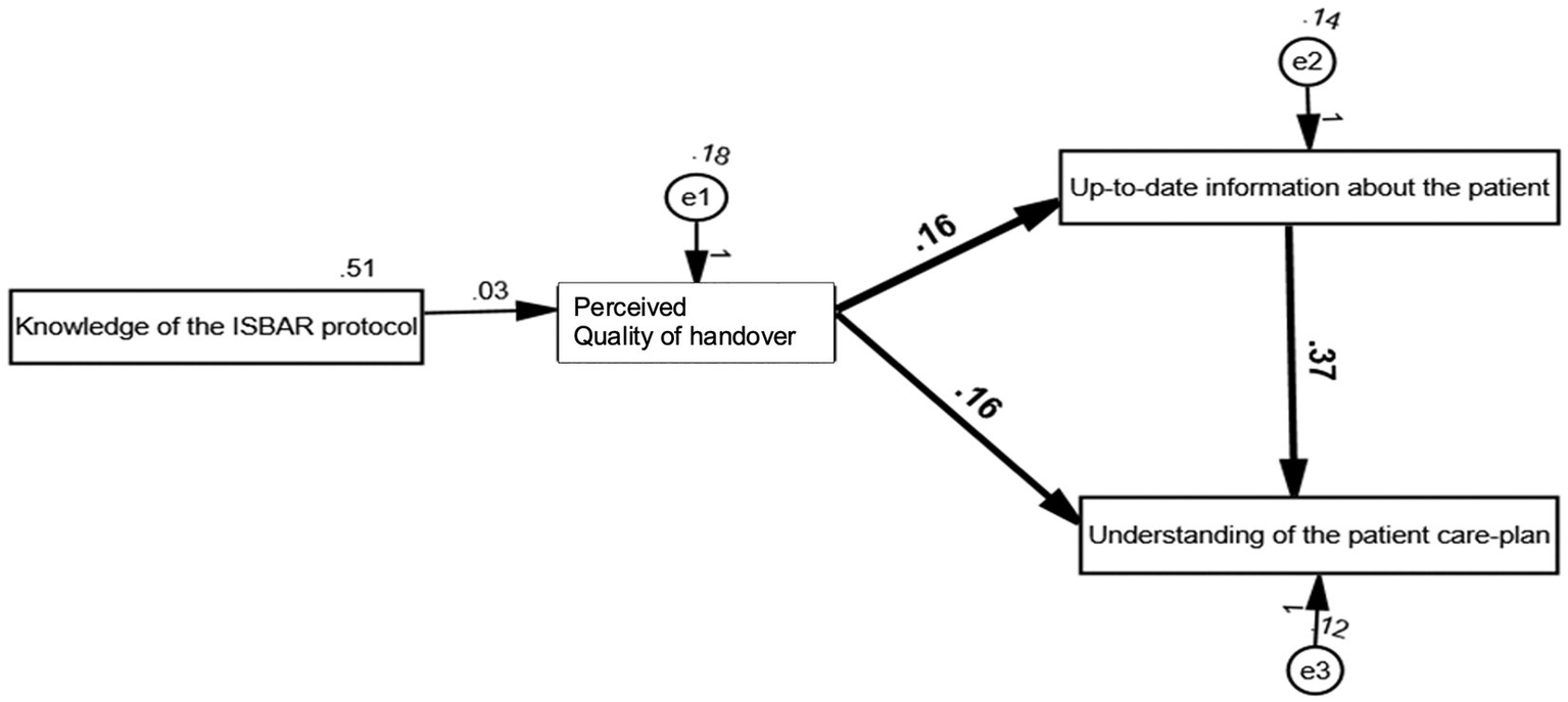 The indices of the hypothesised model indicated a very good model fit [χ2(2) = 0.93, p > 0.05, RMSEA = 0.00, TLI = 1.01, CFI = 1.00; Figure 2]. As shown in Table 3, three of the hypothesised paths were statistically significant. The perceived quality of handover was found to be directly connected with the understanding of the patient care plan and the level of up-to-date information about the patient that they received. In addition, up-to-date information was positively and significantly associated with the understanding of the patient care plan. However, no significant association was found between participants’ knowledge of the ISBAR protocol and the perceived quality of handover.