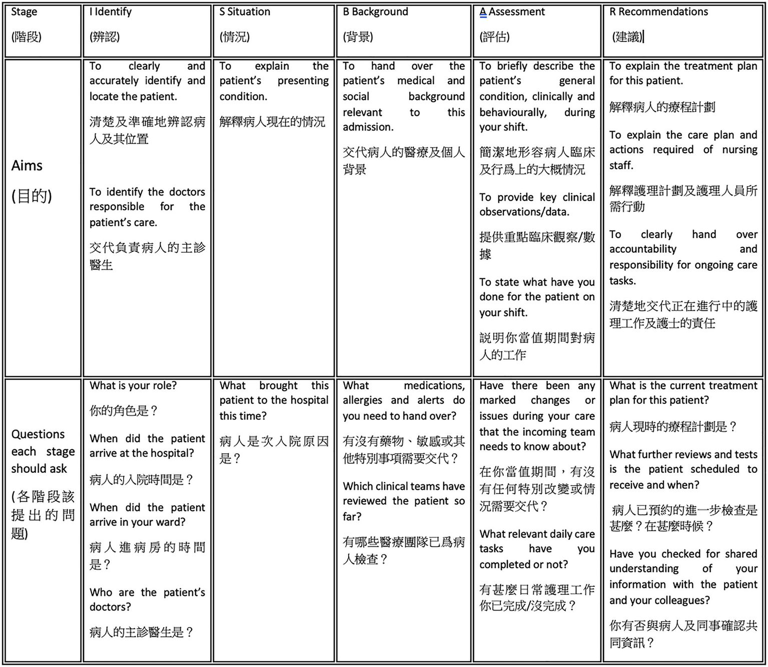 In Hong Kong, the use of Cantonese for reporting patients’ latest condition, together with the use of English for communicating medication or treatment information, code-mixing between Cantonese and English at handovers, and the use of English for medical records and in the training of healthcare practitioners make the bilingual handover communication highly complex (Bourhis et al., 1989). This complexity in a bilingual context is especially evident among nurses with less experience. This may create many opportunities for loss of information during handover communications, which is why a bilingual version of the ISBAR protocol (see Figure 4) should be made available to enable bilingual nurses to conduct an effective and accurate exchange of information about patients’ conditions in both Cantonese and English to ensure good-quality patient care. It is believed that training in the use of the ISBAR tool would reduce the frequency and severity of patient harm resulting from poor quality handover and improve teamwork within and across disciplines (Bakon et al., 2017).