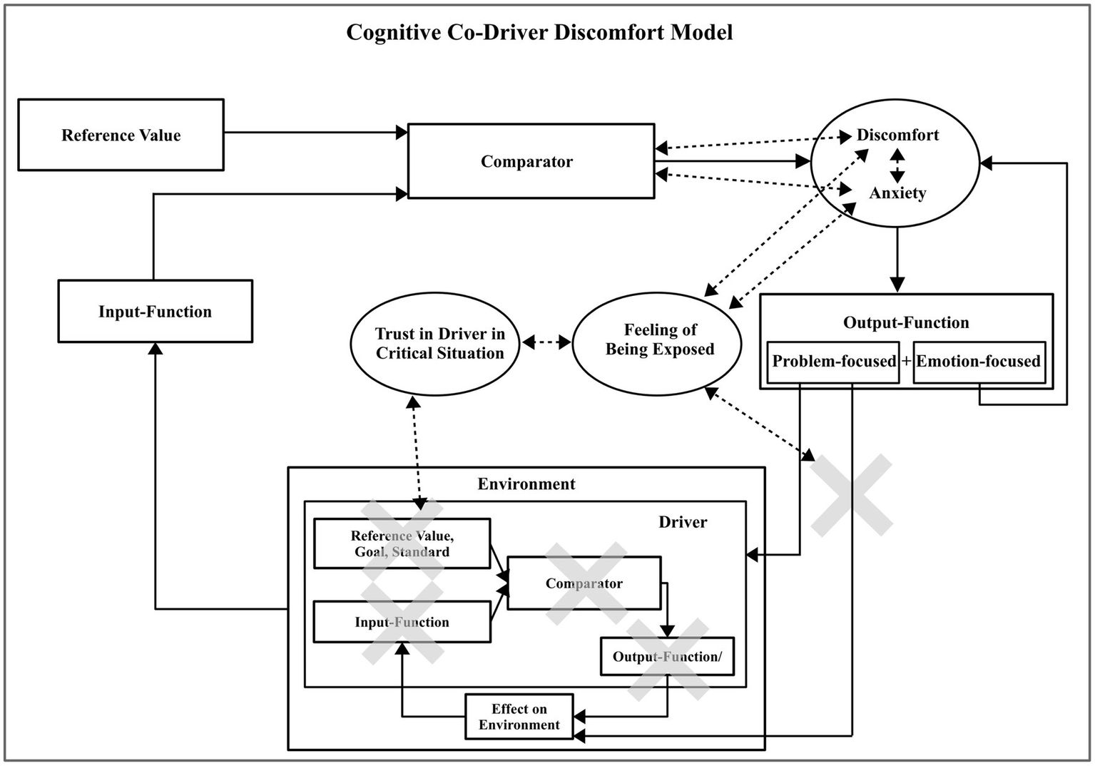 Cognitive passenger discomfort model based on Ittner et al. (2020). From the perspective of the passenger, the driver is part of the environment. Aspects in the model that are only sparsely or not available for passengers and therefore contribute to their discomfort are represented by gray crosses. The dashed arrows show correlated emotional concepts that were verified in the original study (Ittner et al., 2020).