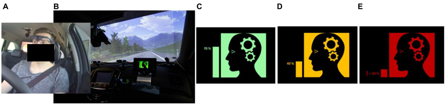 Driver attention display. (A) driver with eye-tracking glasses and two EEG electrodes in the temporal area. (B) Passenger display on the dashboard, showing the attention status of the driver. (C–E) Icons used for high (70–100%), medium (40%) and low/critical (<20%) attentiveness of the driver.