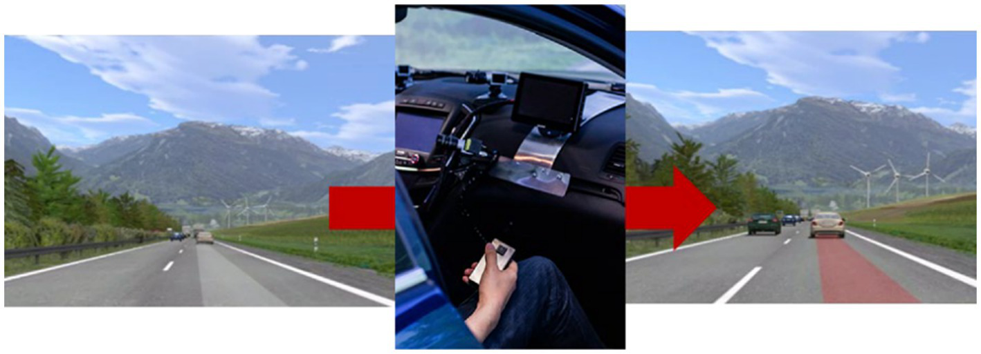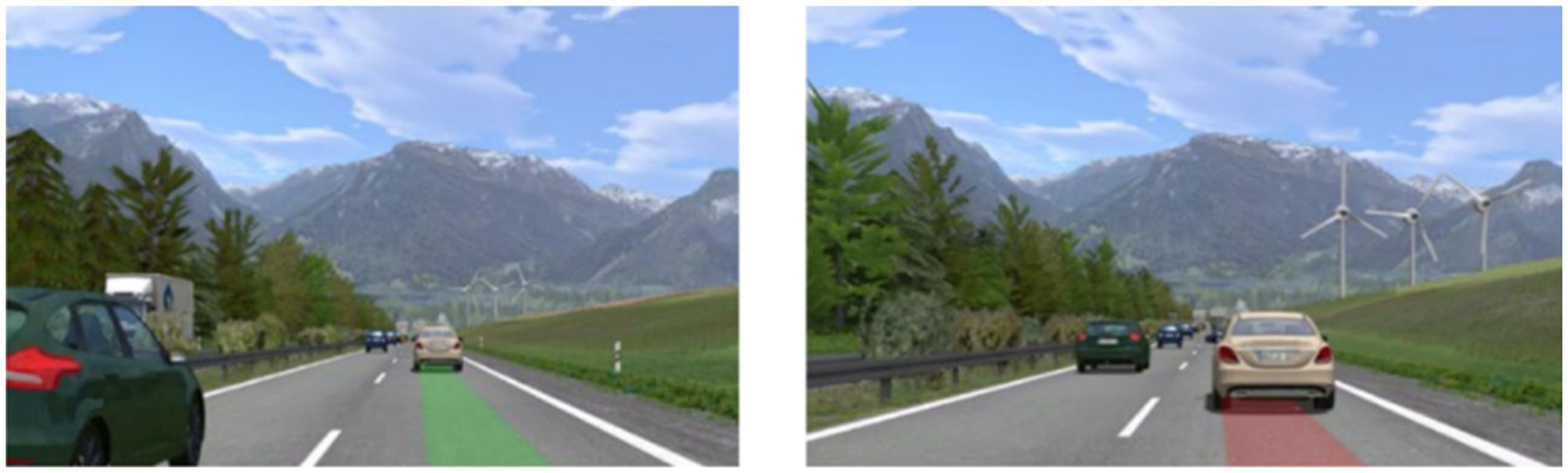 This passenger assistance system has the target to communicate to the passenger that (s) he has a shared understanding of a ‘safe’ distance to the front vehicle with the driver. This should provide information about the driver’s comparator function in the passenger model. The visualization was, similar to the “Preferred THW head-up display,” implemented as a semi-transparent bar on a head-up display, which had a green color as long as a defined safety distance was kept (Figure 5 left). When the distance was too small the bar changed its color to red (Figure 5 right). The participants received the explanation that the red color signals that the driver would no longer be able to react in time to a sudden break of the front vehicle due to physical constraints of the vehicle, and an accident could not be avoided. However, the safety threshold was set to 0.3 s so that participants always received positive feedback about the safety distance (green bar) to communicate all experienced situations as objectively safe.