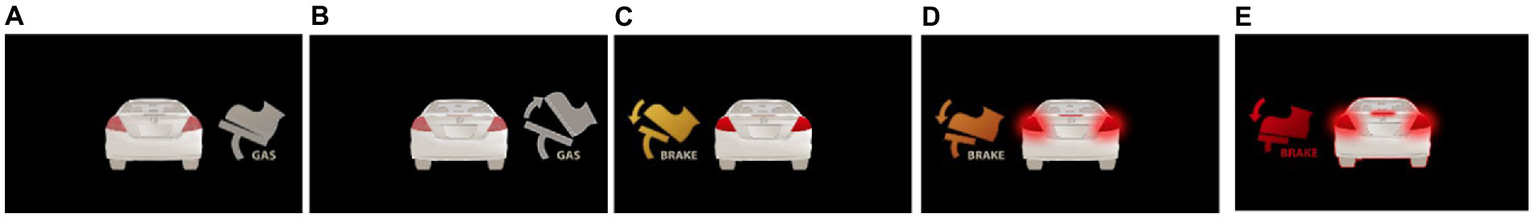 Braking information display. Icons shown when the driver has his foot on the gas pedal (A), releases the gas pedal (B), and applies different intensities of pressure to the brake pedal (C–E).