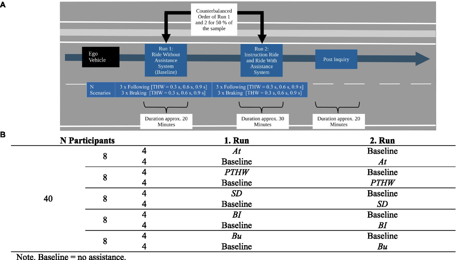 as a passenger on a two-lane highway. The remaining time of 50 min was used for the introduction of the assistance systems and interviews after the session. Every participant experienced one run without assistance and one run with one of the passenger assistance systems (system = between-subjects with a sample of N = 8 participants per assistance system). The order of the two runs was counterbalanced (Figure 8A). Before the run with assistance, the driver and each passenger experienced the range of information that the respective human-machine interface can display in a suitable situation with an explanation by the experimenter. During the road sections, which connected the scenarios, the passengers answered the scenario-specific questions. The questions were organized in a folder that allowed them to answer the questions covertly in front of the driver. This should prevent the participants from giving lenient ratings in the scenarios because the driver could see a negative evaluation and take it as criticism. For an overview of the study design, see Figure 8B.