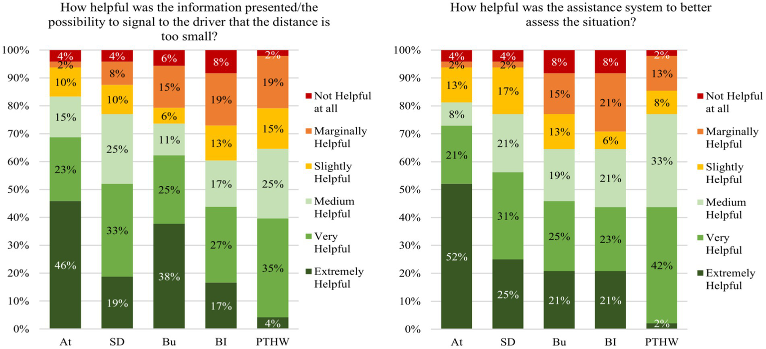 Figure 10 (left) shows the distributions of the information/influence helpfulness ratings over all 48 scenarios driven by all N = 8 participants (6 scenarios per participant) for each assistance system. The participants rated information presented by the “Attention” passenger assistance system as very or extremely helpful in 69% of the scenarios and in an additional 15% of the scenarios, the presented information of the system was rated as medium helpful. Similarly, in 60% of the scenarios, the participants rated the information and influence possibility provided by the “Button” system as very or extremely helpful, and in 13% of the scenarios as medium helpful. For the “Safety Distance” assistance system, the proportion of scenarios in which the information was rated as very or extremely helpful was slightly lower with 52%. On the other hand, the proportion of scenarios in which the information was rated as moderately helpful was higher with 25%. The information presented by the other two assistance systems was very or extremely helpful in less than 50%. The distribution of ratings for the question of how the assistance systems were helpful to better assess the scenario was similar (Figure 10 right). The “At” passenger assistance system was again very or extremely helpful in most of the scenarios (73%) followed by the “SD” (56%) and “Bu” (46%) systems. The other two assistance systems were very or extremely helpful in fewer scenarios (44% for “BI” and “PTHW” each).