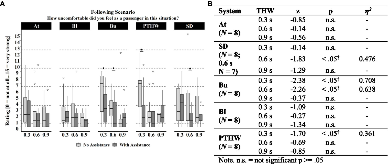 Results show that most participants felt strongly uncomfortable during short time headways in the Braking scenario (m = 11.56, sd = 3.21), especially compared to scenarios with the longer time headway (m = 5.11, sd = 3.41). Detailed tests showed that this difference is significant (Asymptotic Wilcoxon-Test: z = −2.68, p < 0.05, n = 9, η2 = 0.80). The same relation was found for the Following scenarios (Asymptotic Wilcoxon-Test: z = −2.53, p < 0.05, n = 9, η2 = 0.71). In the Following scenario participants experienced medium discomfort during short time headways (m = 9.00, sd = 3.20) and low discomfort during long time headways (m = 5.89, sd = 3.37).