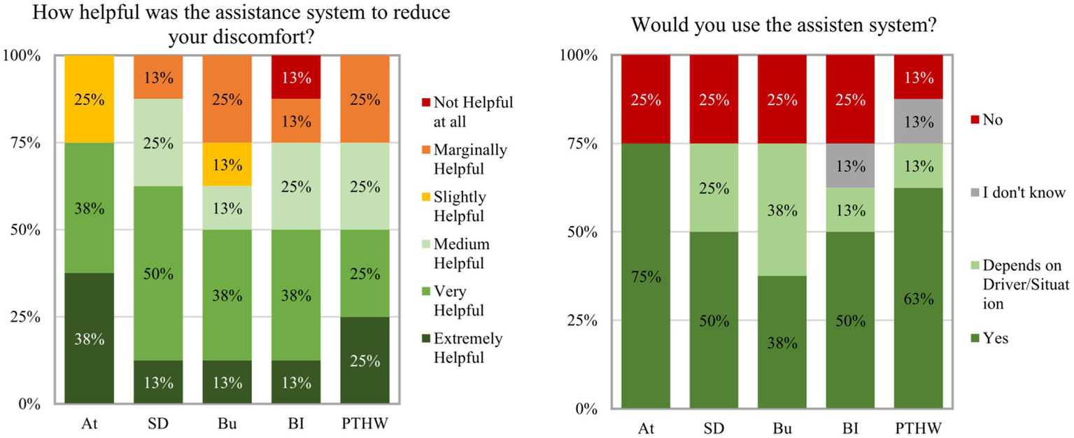 In the post inquiry, participants rated how helpful the assistance system was to reduce their discomfort in general with the same 16-point category subdivision scale, and they were asked if they would like to use the experienced passenger assistance system in a future car.
