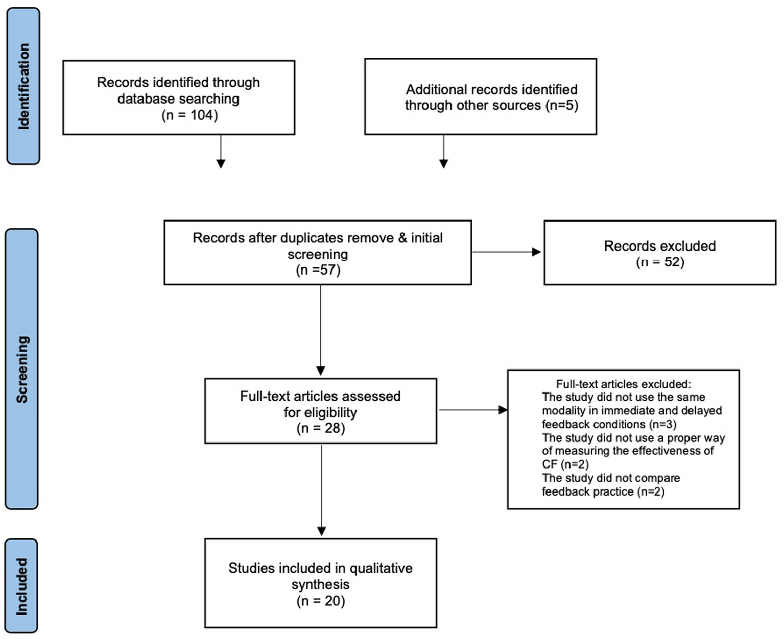 This first search identified a total of 109 potentially eligible articles. After removing duplicates and initial screening of the titles, 57 studies remained in the pool. The two authors then analyzed the titles and abstracts separately. Then they discussed the results of the reviewed studies and excluded 29 studies, leading to 28 studies to assess for eligibility based on full-text analysis. The first and second author read the 28 full-text studies and independently analyzed whether they met the inclusion/exclusion criteria. After independent analysis, the authors discussed the results to determine which studies should be included in the synthesis. The full-text analysis led to the elimination of 8 studies: 3 because of applying different modalities in immediate and delayed CF conditions, 2 because of using improper ways of measuring the effectiveness of CF, and 2 because of not comparing the practice of feedback (see Figure 1 for the flow chart). 20 studies were included in the systematic review (see Table 1 for details). According to Petticrew and Roberts (2006) and Gough et al. (2012), the number of studies included in a systematic review mainly depends on the research topic and all available studies related to that question. Although the number of included studies seems to be small, Gough et al. (2012) argued that to find the few that are on topic, a lot of irrelevant studies have to be sifted through. Given feedback research almost invariably examines immediate feedback, feedback timing is a narrow scope and a new territory in feedback research and in SLA research in general. In this case, the amount of supportive evidence available is limited (Table 2).