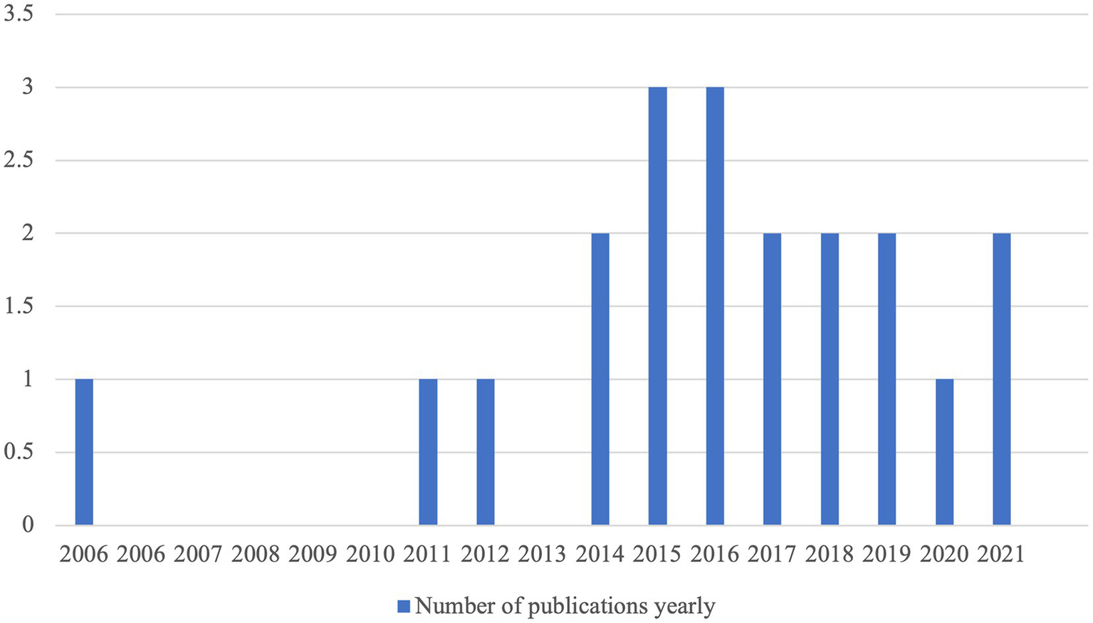 The yearly distribution of the publications included in this systematic review (2006–2021).