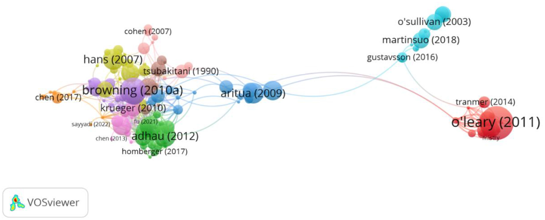 First, we performed a bibliographic coupling analysis based on the papers. As a threshold, we used a number of 5 citations per document. This inclusion criterion limited the number of primary documents to a manageable size, leading to a clearer visualization (Zupic and Čater, 2015). This resulted in a network composed of 130 items. The document with the highest coupling strength is the book of Walter (2015), Multi-Project Management with a Multi-Skilled Workforce, with a total link strength of 4,069. The book covers the topic of optimization in managing multiple project teams. This is followed by the paper of Seddon et al. (2010), in MIS Quarterly (total link strength of 3,029), where they develop and test a long-term, multi-project model of factors affecting organizational benefits from enterprise systems. The third paper is the one of Homberger (2012) (total link strength 1,873), where the author looks at a coordination mechanism for agent-based multi-project scheduling.