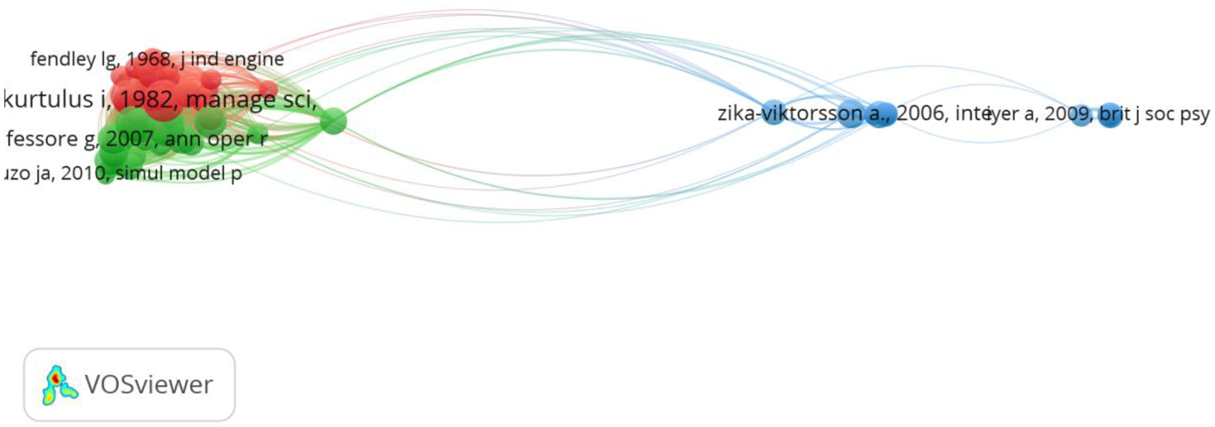 First, we performed a co-citation analysis based on cited references, we limited the number of citations of a cited reference to 10, to facilitate the visualization.2 The sample resulted in 59 papers, with a total link strength (the frequency with which two secondary documents are co-cited by primary documents) varying from 472 to 25. Three clusters emerged (Figure 3). Clusters 1 (red) and 2 (green) on the left side of the graph cover mostly topics related to heuristics, meant to facilitate multi-project scheduling. They belong to the Operations Research and Industrial Engineering field. Although depicted as two separate clusters, their position in the network indicates that they are very closely related, possibly due to their topic similarity. On the right side, the third cluster (blue) represents the Management and Applied Psychology field. The main topics here relate to forms of multi-teaming (e.g., variety, number of teams) and their effects on organizational outcomes such as performance or stress. Another discussion in the field is whether multiple team membership represents a demand or a resource for the employees. A detailed description of the most prominent papers in each cluster can be found in Table 1.