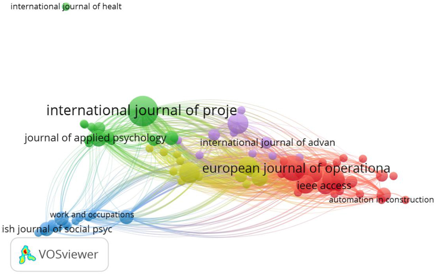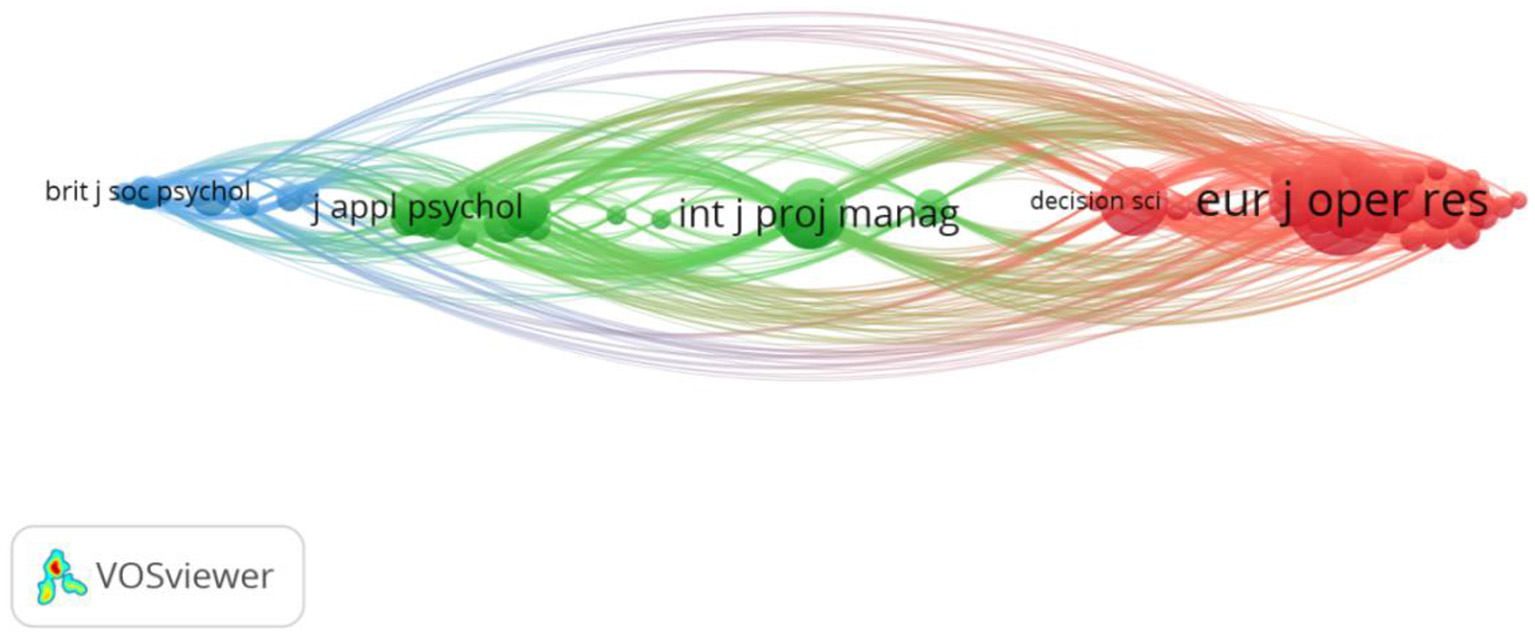 What we observe, also in line with the document analysis, is that the main fields of Operation Management, Computing and Industrial Engineering, Management and Applied Psychology are closely connected to each other, while the emerging Social Psychology field has a more marginal position. Also, the International Journal of Project Management is still the most prominent, with 13 papers and 345 total citations followed by the European Journal of Operational Research with 9 papers and 279 citations.