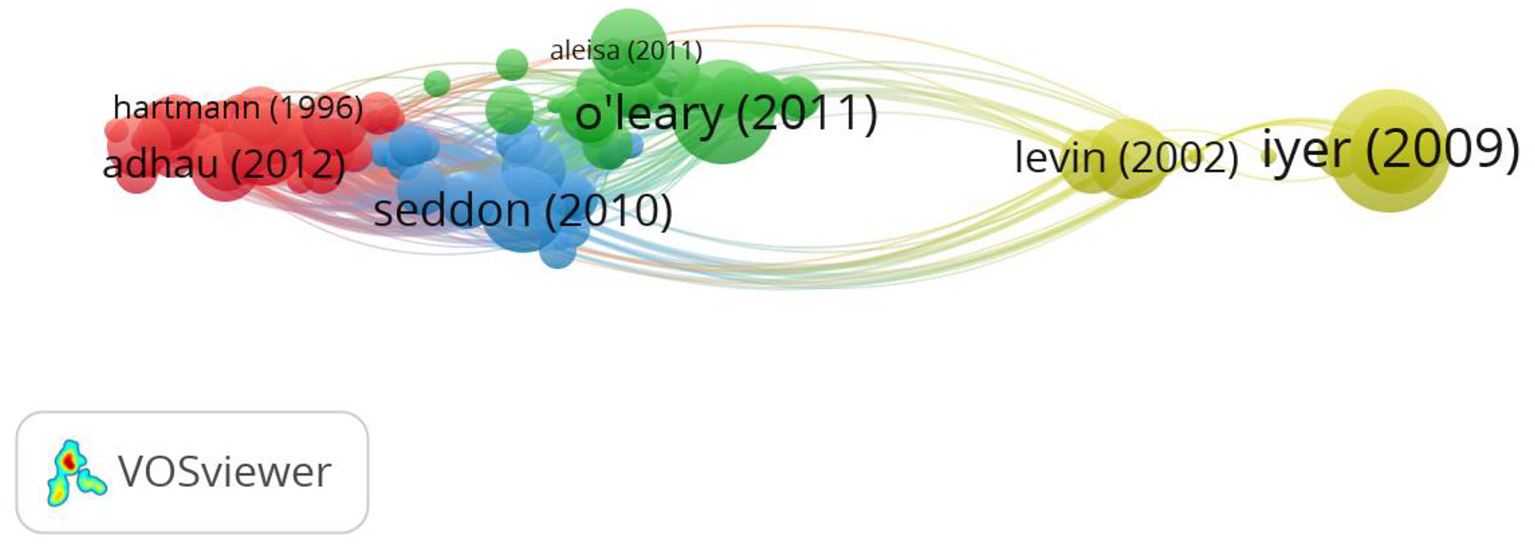 Co-citation analysis is the second analytic set and it refers to the frequency with which two secondary documents are co-cited by primary documents. The VOSviewer software creates a secondary dataset that includes all the documents that are co-cited together in the primary documents. The visualization is created based on this secondary dataset. The principle is that the more two documents are co-cited together, the more likely it is that they are semantically related and the more important they are in the field (Small, 1973; Zupic and Čater, 2015). This type of analysis reveals the underlying intellectual structure, theoretical foundations or the roots of a particular field (Zupic and Čater, 2015; Donthu et al., 2021).