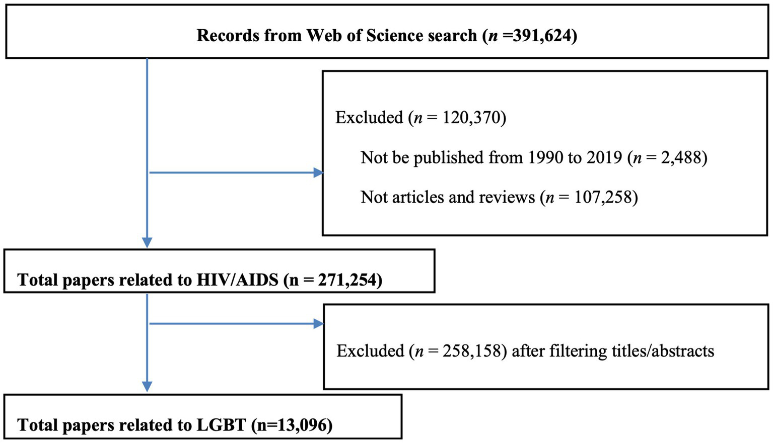 The Web of Science Core Collection was used to search the publications. This database was selected based on its advantages in providing more comprehensive data compared to other databases such as Scopus or PubMed (Clarivate Analytics, n.d.; Martín-Martín et al., 2018). We set the duration in 20 years from 1990 to 2019, with language restriction to English only. We also included only original articles and reviews which studied or mentioned LGBT population in the field of HIV. Other types of documents were excluded.