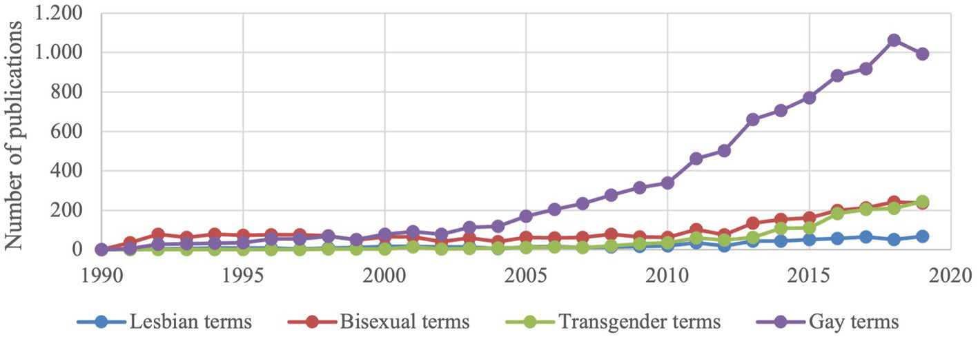 Table 1 shows the characteristics of the selected articles. From seven articles in 1990, the number of publications remarkably increased to 1,205 in 2019, resulting in a total of 13,096 publications in the whole period. Articles published in 2013 had the highest number of citations (19,584), total usage in the last 5 years (9,873 downloading times), and the mean use rate in the last 5 years (2.57 downloading times/paper/year). The number of publications regarding different populations (lesbian, gay, transgender, and bisexual) is presented in Figure 2. Publications about gay (or men who have sex with men) group had the highest number (accounted for nearly 70% of the total number of publication) over the time period, following by bisexual, transgender, and lesbian.