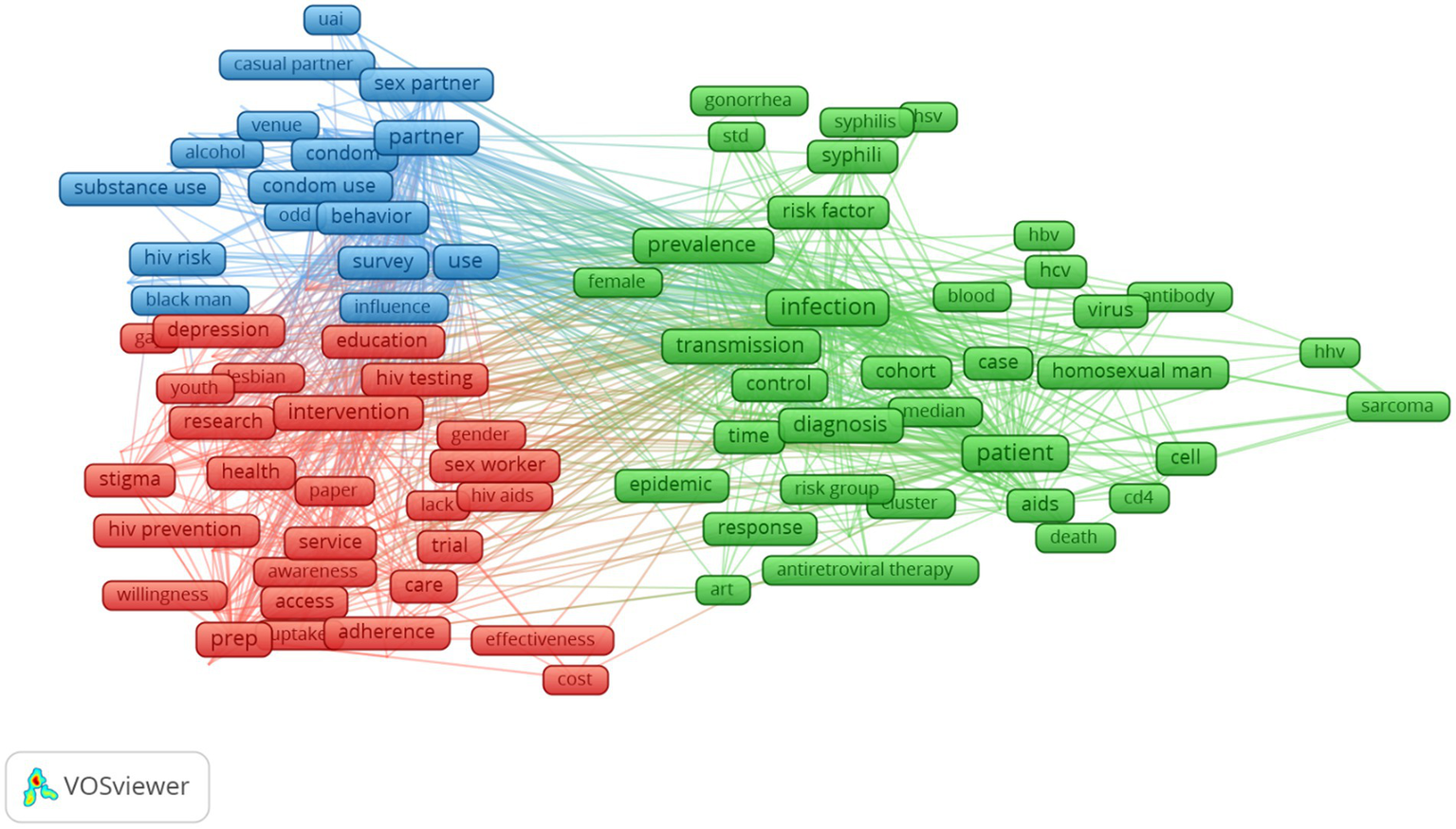 Analysis of the most frequent terms is visualized in Figure 4. A total of three clustering of co-occurrence terms were developed. The green cluster mentioned topics about HIV/STIs prevalence, risk factors, and treatment among LGBT populations. Meanwhile, the blue cluster referred to topics about HIV-related risk behaviors (substance use, sexual risk behaviors), and the red cluster indicated topics about HIV prevention and testing service access (including HIV testing, pre-exposure prophylaxis), stigma and mental health.